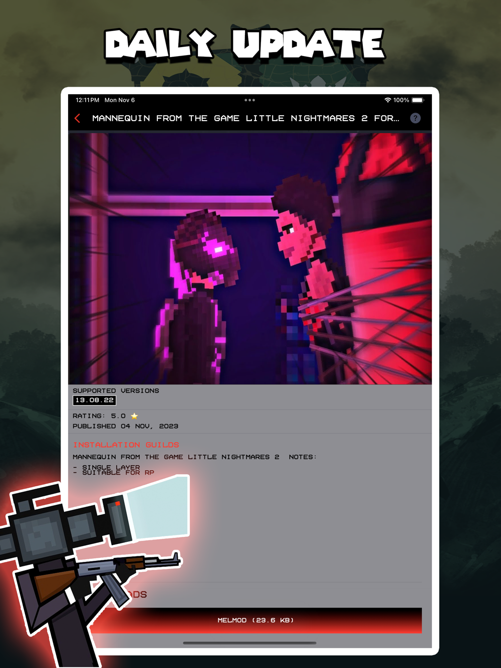 This is an unofficial app. This is not Melon Playground game. This app is a list of handpicked Mods (Addons) with a handful and convenient way of downloading and installing them. All content rights belong to their authors. Each author is credited. Any Mod isn't approved by third party trademark holders. It's made by fans for fans!