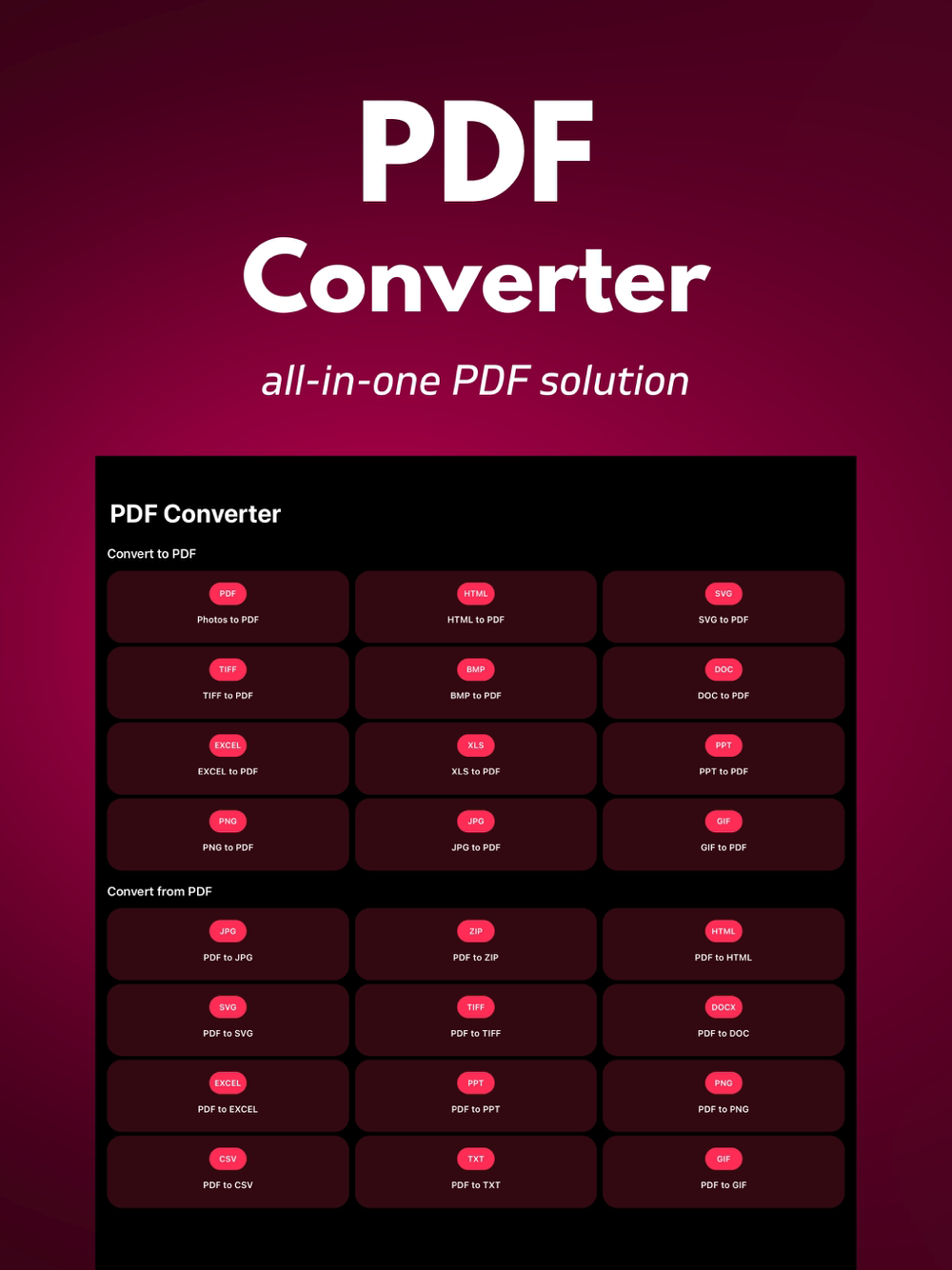* Convert from PDF: Need to extract content? PDF Converter can convert PDFs into a variety of formats including JPG, PNG, SVG, TXT, ZIP, DOCX, PPTX, and XLSX. Extract what you need with ease.