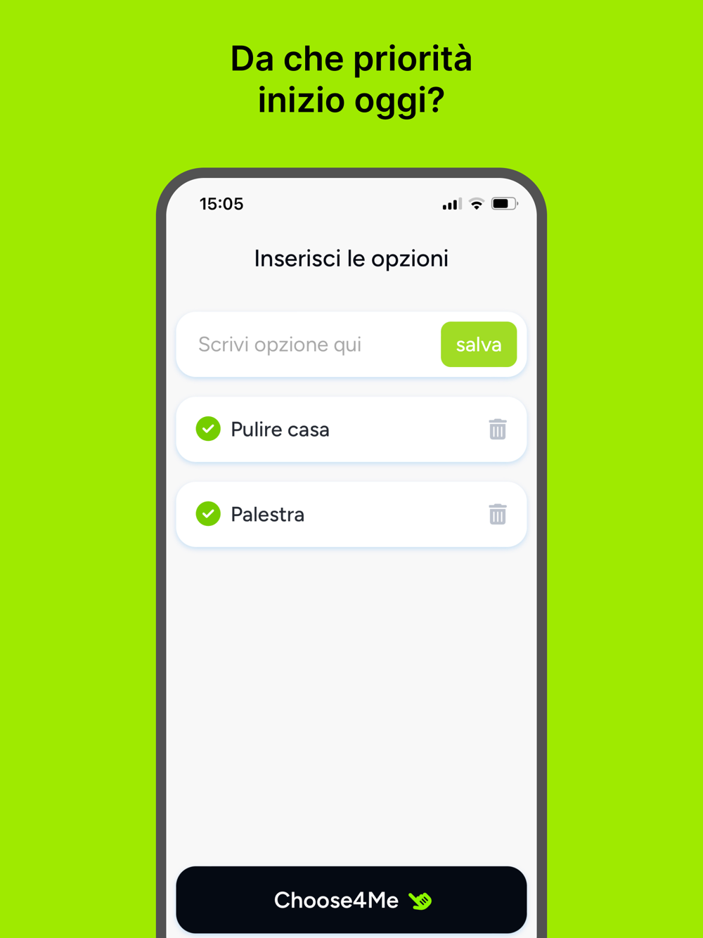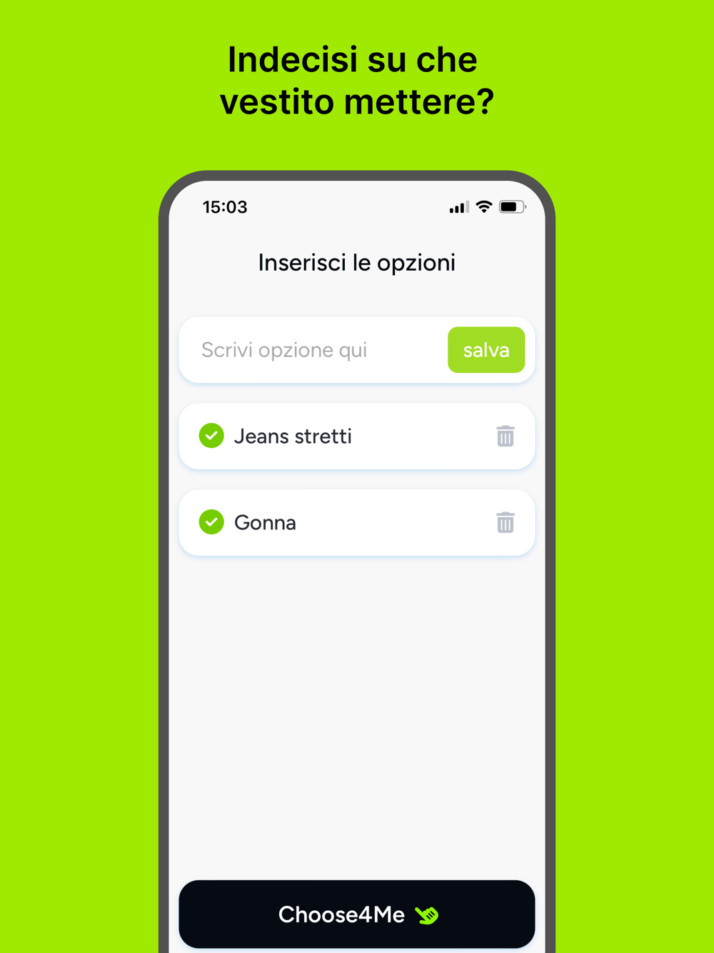 Choose4Me ti aiuta ad essere più efficiente nelle decisioni più stupide e temporanee della tua vita. Sei indeciso su che vestito mettere o che pizza prendere? Inserisci le opzioni sull'app e clicca il tasto "Choose4Me". Sceglierà per te, facendoti risparmiare tempo prezioso e pensieri inutili.