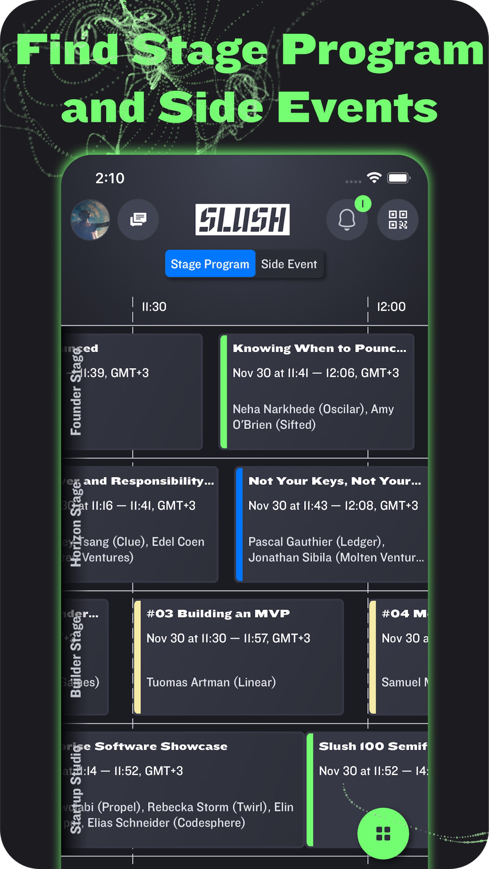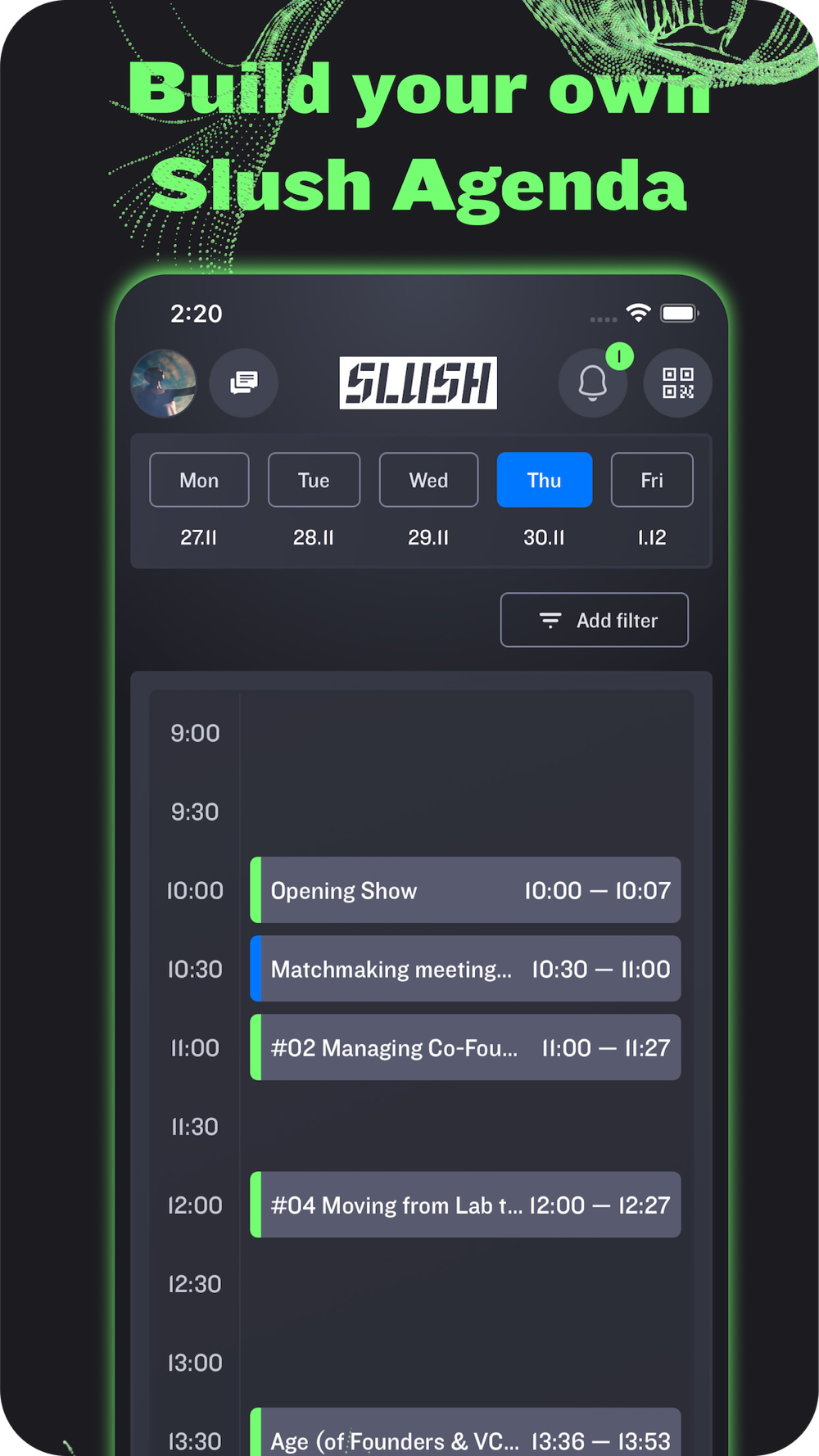 - Create your Agenda: Build your own schedule for the Slush Week. In one view you can browse your accepted meetings, stage talks you’re interested in, 300+ Side Events, and add to your agenda the ones you want to attend.