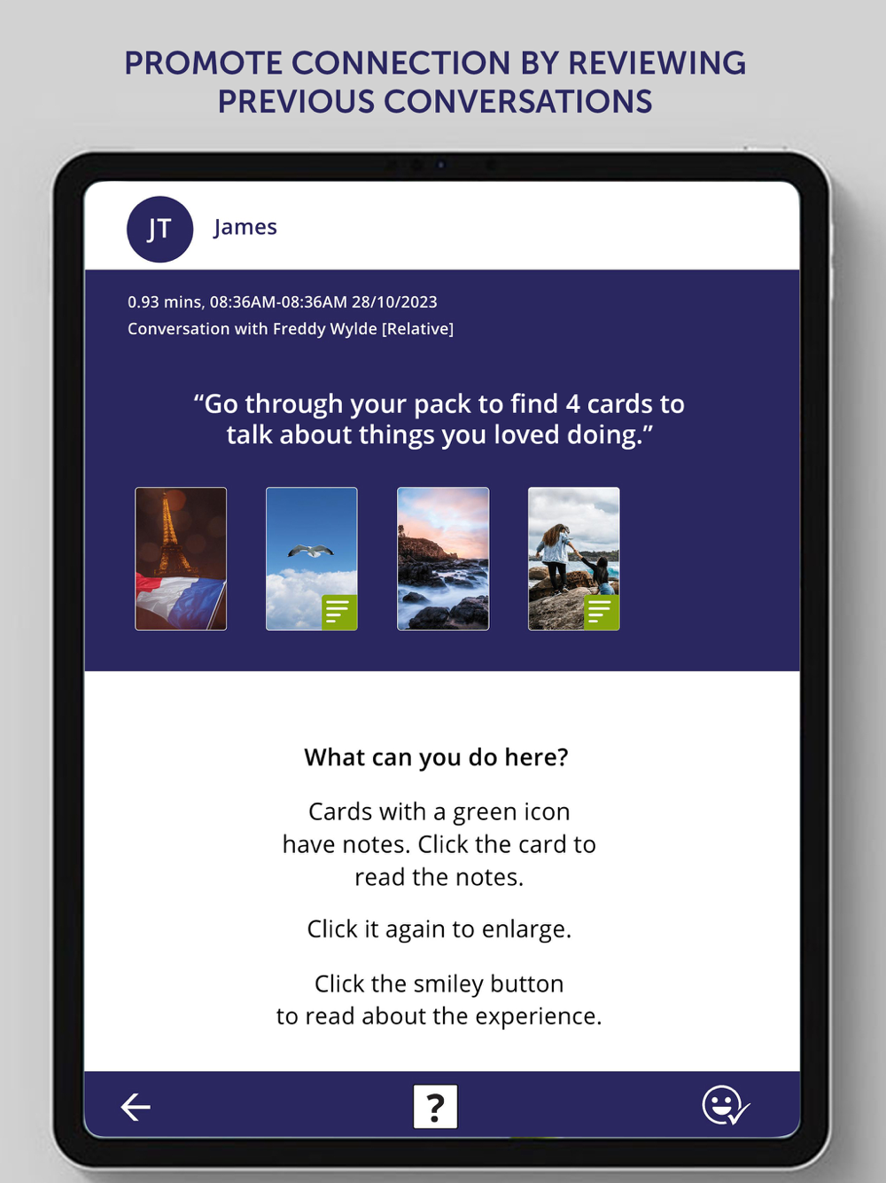 Carers can use CARISA anytime to help them offer planned or impromptu moments of social-emotional support for residents (just grab a tablet and start).