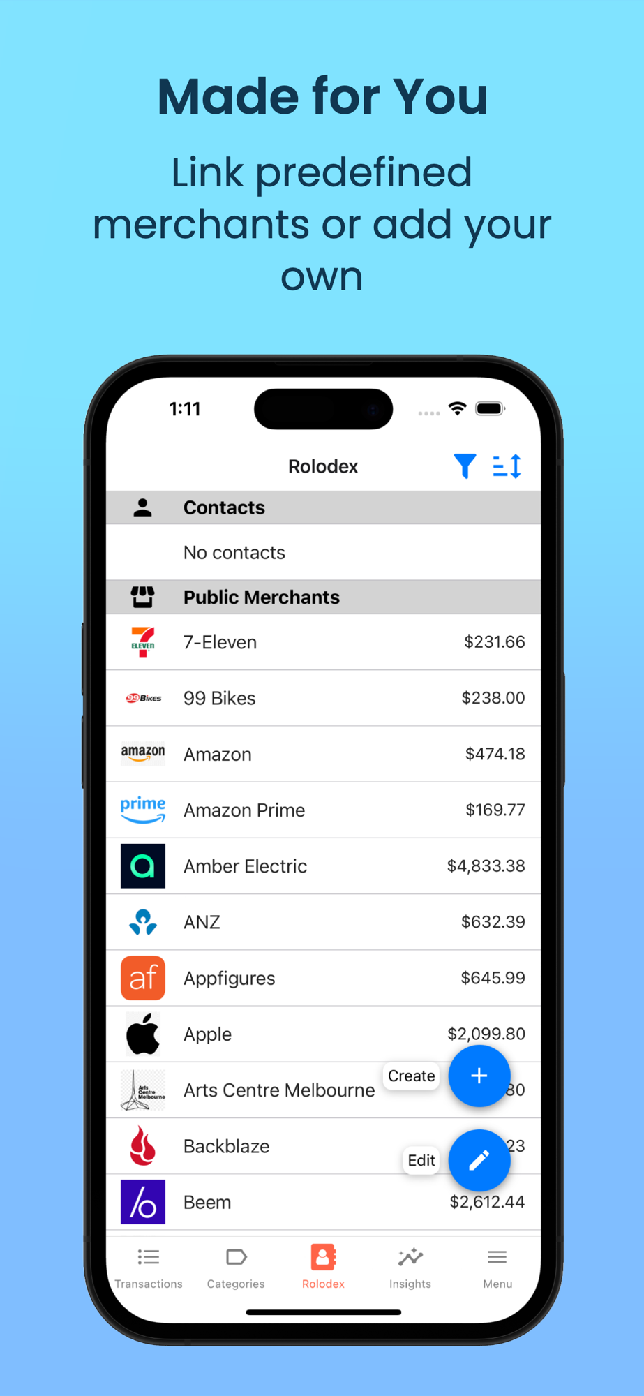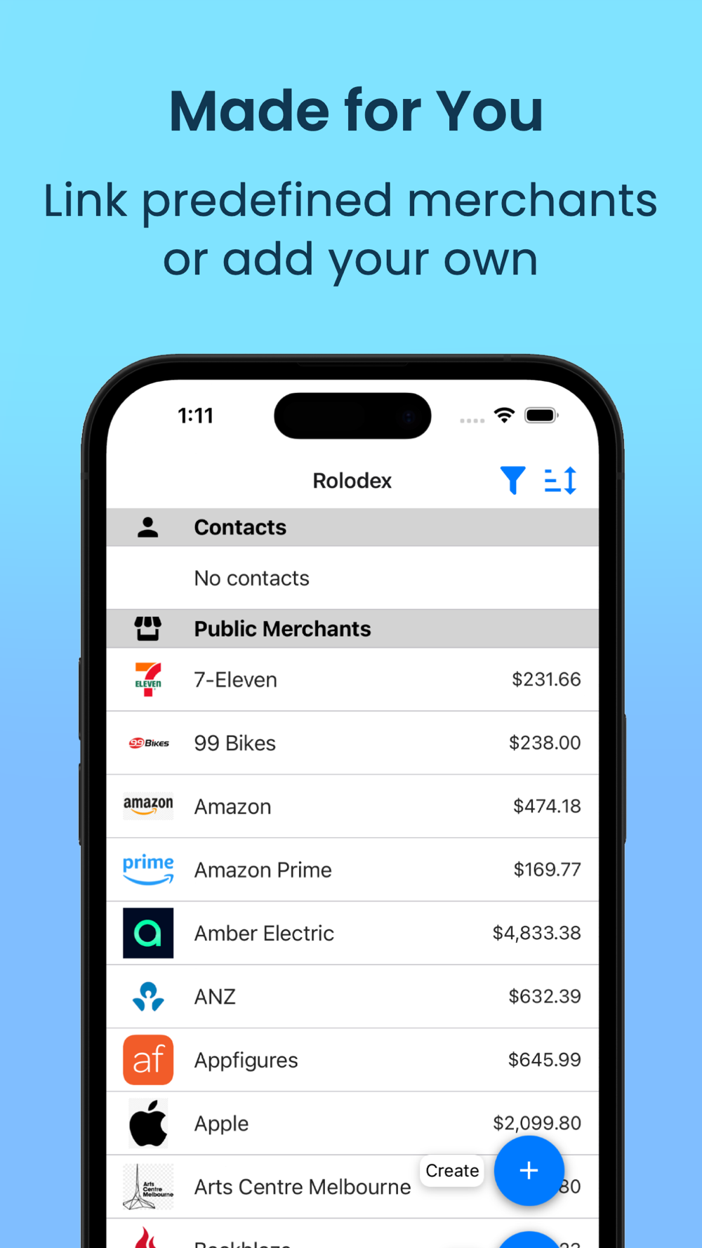 Keep track of your financial relationships by adding your own contacts. Know where your money is coming from and going to, with a personalised rolodex that puts you in control.