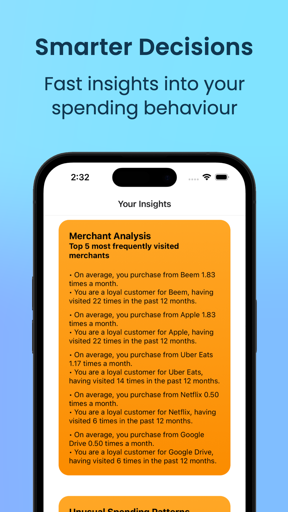 Unlock a deeper understanding of your spending behaviour. Receive personalised insights that shed light on trends, patterns, and opportunities to optimise your financial habits.