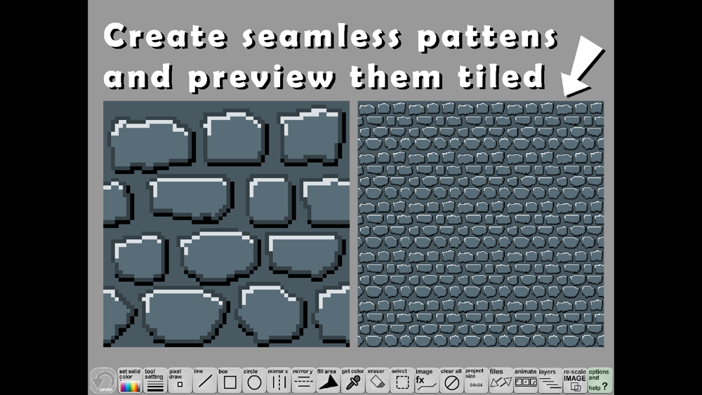 Sprite Tight is your go-to pixel editing and animation solution. Simple menu and easy to use interface make creating pixel art actually fun. Create perfect tiled patterns to use as backgrounds images for graphic design or social media. Use the advanced animation mode to create GIFS! Export and share your art as still images or animated GIFS.