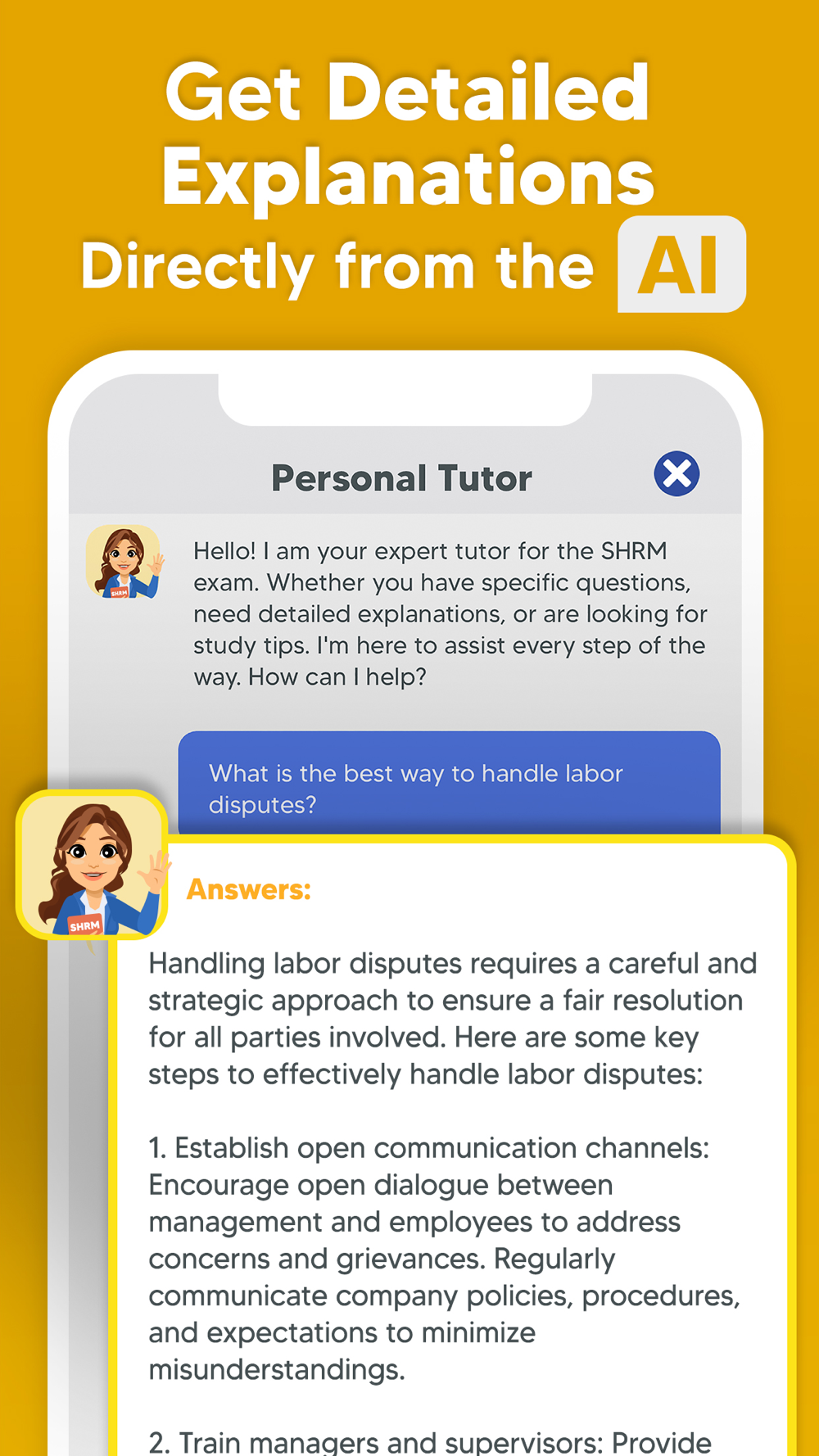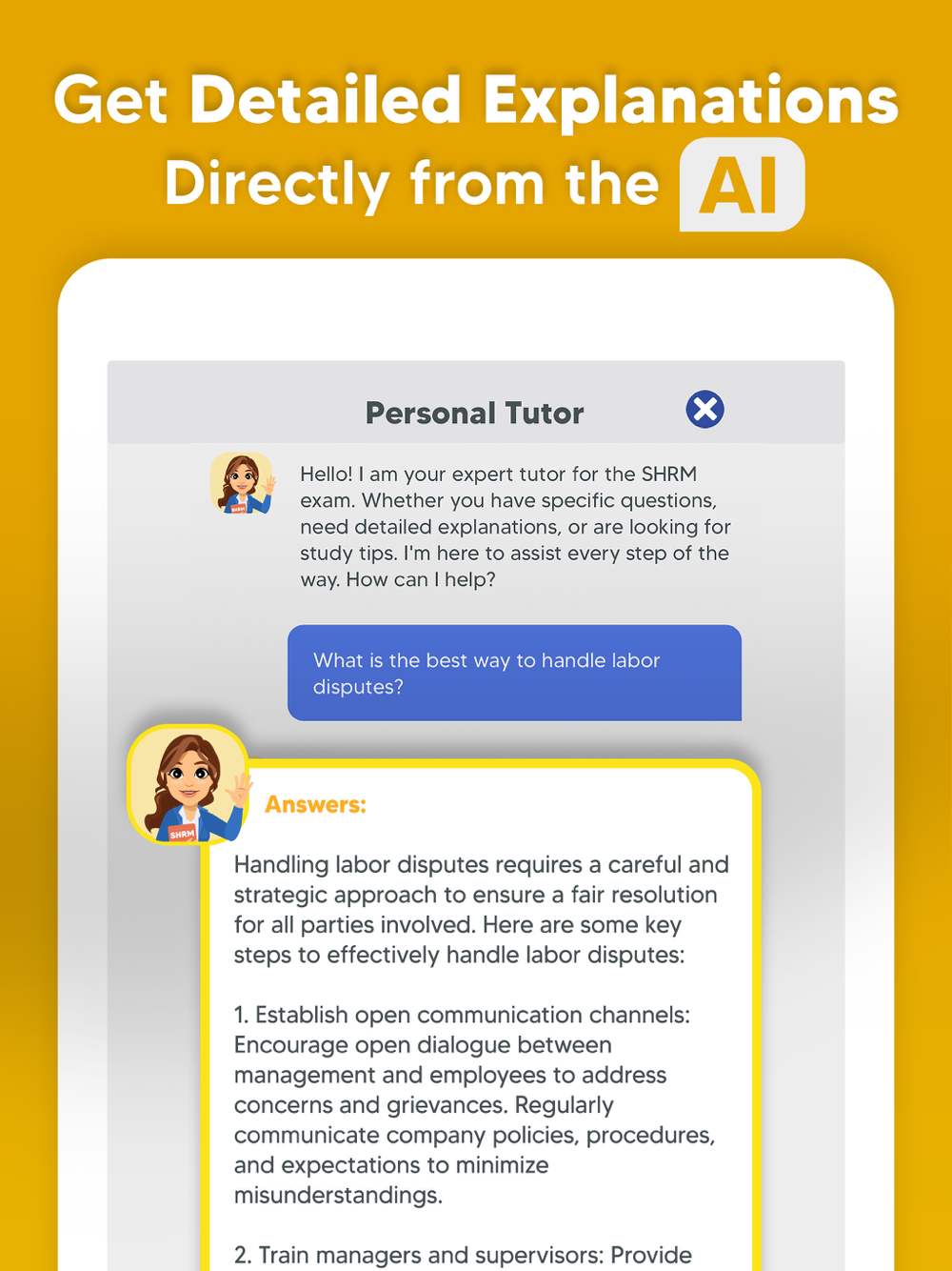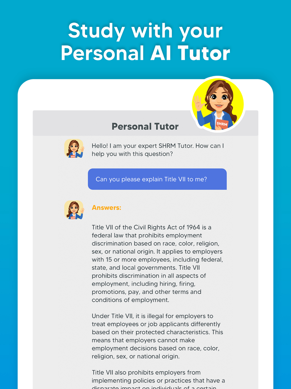 We are excited to unveil our revolutionary AI feature, powered by ChatGPT, tailored to elevate your exam prep experience for the SHRM-CP or SHRM-SCP. This state-of-the-art tool offers immediate, customized support on the toughest exam subjects, ensuring you're well-equipped to tackle any challenge. Our AI, updated with the latest exam materials, flawlessly integrates with our question database, providing detailed insights into both correct and incorrect responses, and extending further advice to enhance your comprehension. Whether you're navigating through intricate HR topics or polishing your expertise, our AI guide is dedicated to assisting you every step of the way, guaranteeing your readiness to excel in your SHRM certification exam.