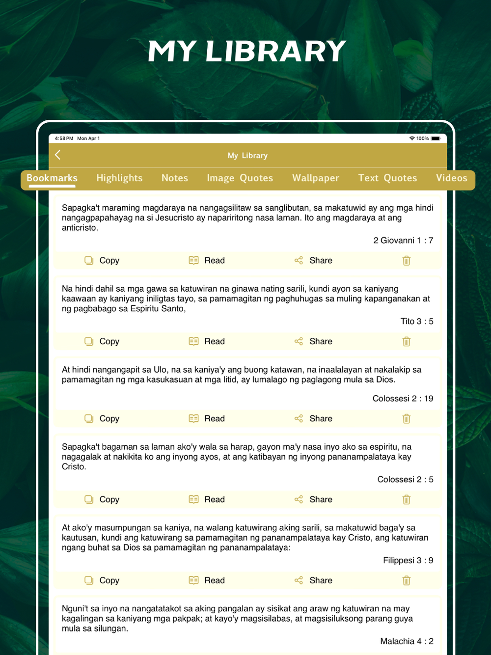 Keep your bookmarks highlights and Bible notes in one place easy to access and organised.