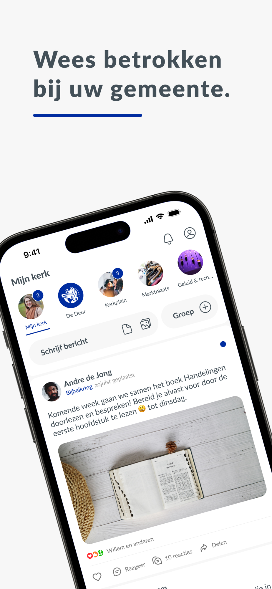Thanks to our unique group structure, we can communicate better. With the entire community, but also among ourselves. You can add groups yourself and invite people to join. A smart timeline ensures that you see personal and relevant information.