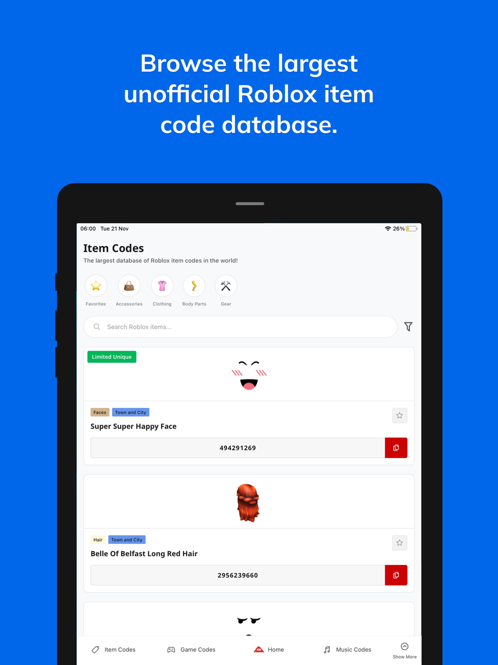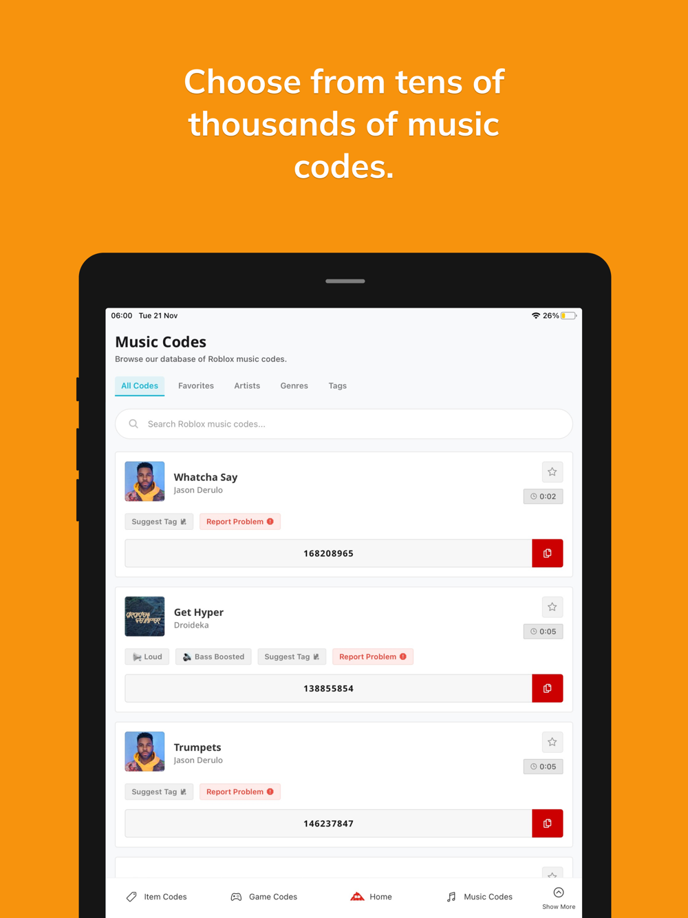 Once you've found a song you want to listen to, just tap the code to copy it to your clipboard and paste it into Roblox. If you want to save a music code for later, just tap the favorite button and it'll be saved to your favorites tab!
