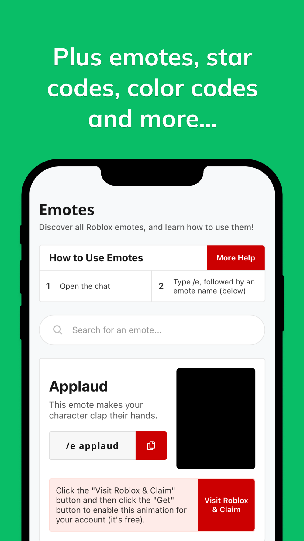 Emotes are dances and actions you can perform in Roblox like clapping, shrugging and cheering. The Bloc Den app lists every emote (including some exclusive ones you might not have known about) and shows you how to perform them.