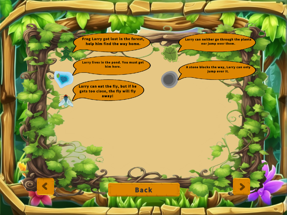 Get ready for a fun and educational adventure with Larry the frog. Help Larry find his way home. This game is designed to teach kids aged 8-12 the basics of algorithmic thinking without requiring prior programming knowledge. With a simple drag-and-drop interface, players can navigate Larry by giving him commands like move, jump, turn left, or right. And don't forget, you can feed Larry flies!