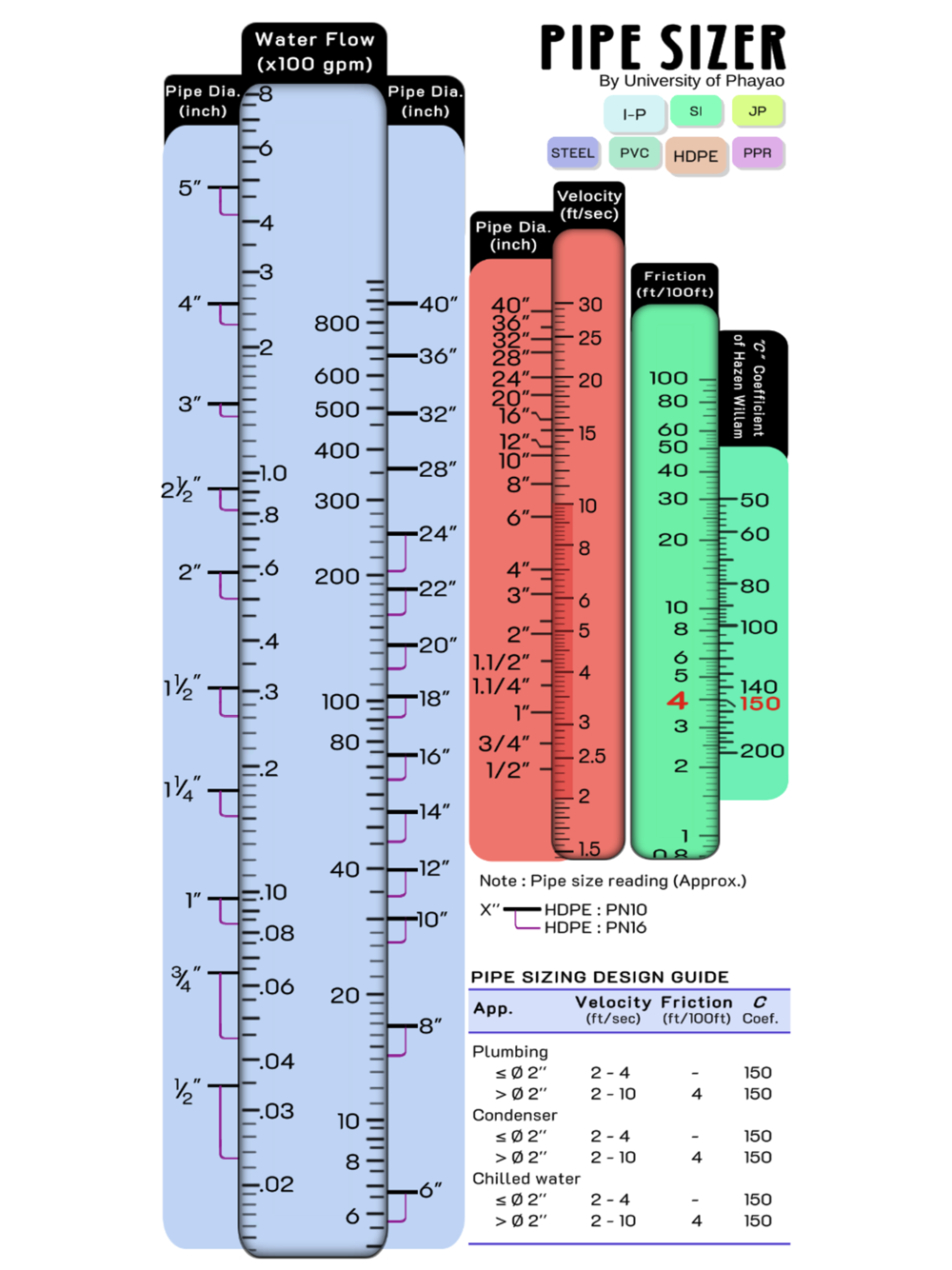 Shows Steel, PVC, HDPE, and PPR pipe sizes for any schedule or class.