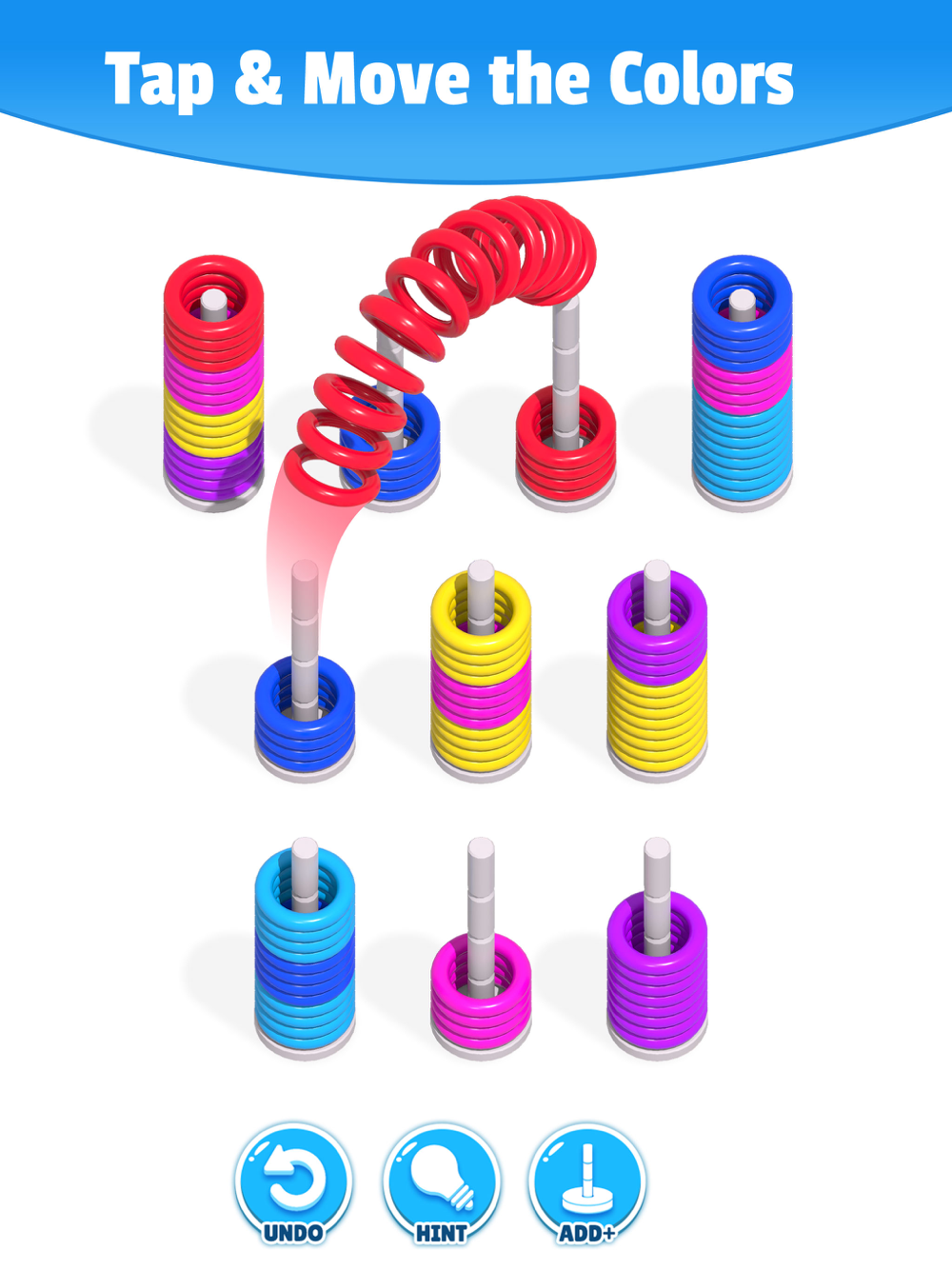 - Drag and drop to move the slinky rings by just tap on same color