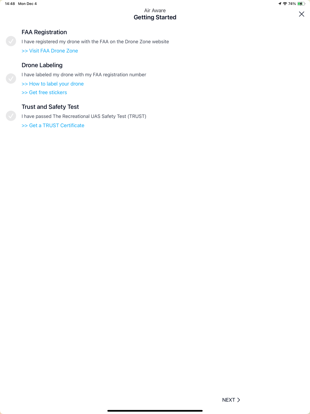 As we've partnered with Pilot Institute, inside Air Aware you will also find links to free resources, such as training videos, FAA TRUST information, and free stickers for labeling your drone.