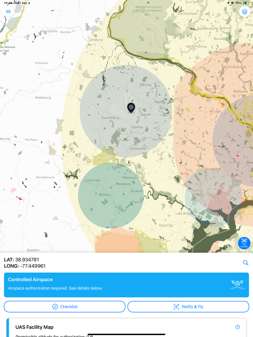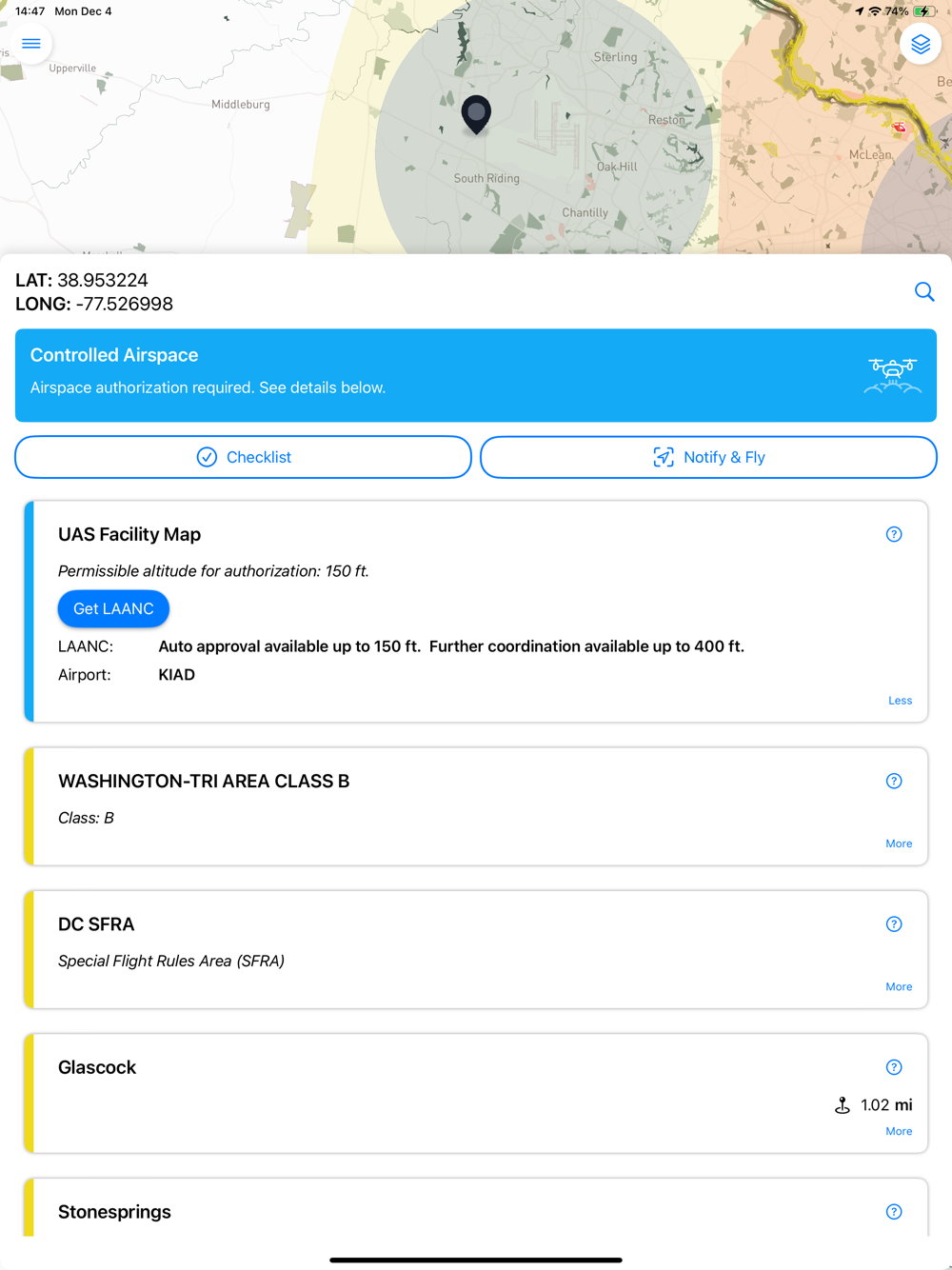 In addition to authoritative airspace information from Aloft (an FAA-approved UAS Service Supplier for LAANC), Air Aware includes Aloft's exclusive Geo layers with over 10 million square miles of local, state, and federal advisory information to assist pilots with takeoff/landing restrictions and other pertinent safety information.
