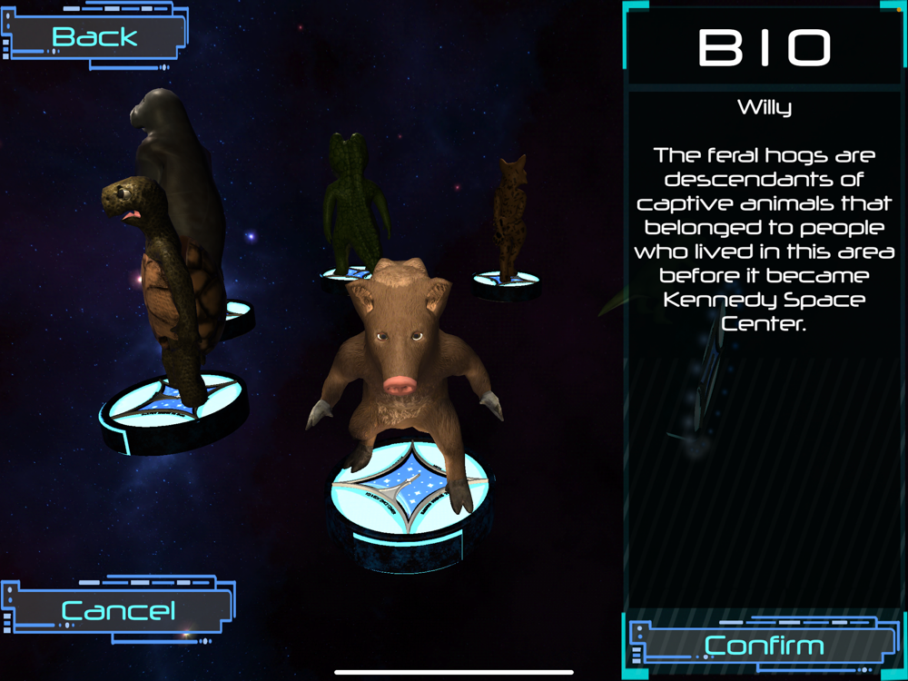 The characters that the player can choose from are represented by animals that are found in the Cape Canaveral Wildlife Refuge which encompasses Kennedy Space Center and Cape Canaveral Space Force Base.