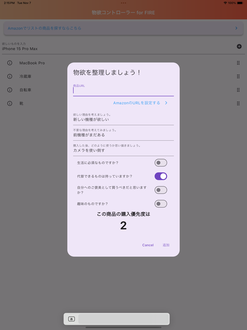 物欲コントローラーは、FIRE(Financial Independence, Retire Early)運動にインスパイアされた新しい時代の購買管理アプリです。このアプリは、使いやすいインターフェースで、欲しいものリストを作成し、それぞれのアイテムに対して「購入したい理由」や「不要な理由」を自己問診式で記入することで、あなたの購買意欲を深く掘り下げることを可能にします。さらに、「購入した後の使用方法」や「生活にとっての必要性」、「代替品の有無」、「自己へのご褒美としての適切性」、さらには「趣味のアイテムかどうか」を評価することで、物欲と理性を分離し、より賢明な消費行動を促します。