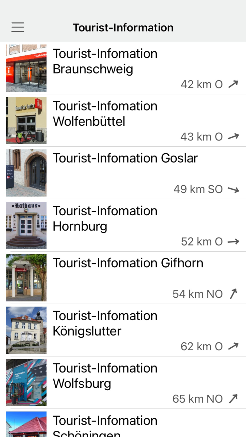 Im Hauptmenü finden Sie eine Liste besonderer Sehenswürdigkeiten, die nach Entfernung von Ihrem aktuellen Standort sortiert ist. Im Hauptmenü finden Sie auch eine Liste mit den 8 Etappen der Rundtour durch das Braunschweiger Land. Die Tour-Beschreibung enthält Informationen wie Länge, Höhenmeter, Schwierigkeitsgrad und der Routenverlauf mit Hinweisen zu den POIs (interessante Orte) entlang der Route. Nach Aufruf der Tour wird der Verlauf in der Karte angezeigt und die Fahrradtour kann starten. Ihre Position wird dabei in der Karte ständig nachgeführt. Wie weit der Weg bis zum Ziel ist, wird durch die Restkilometeranzeige am oberen Bildschirmrand angezeigt. Wird die Route zum Beispiel durch falsches Abbiegen verlassen, ertönt ein Hinweiston. Sicher und entspannt am Ziel ankommen, ist so kein Problem.