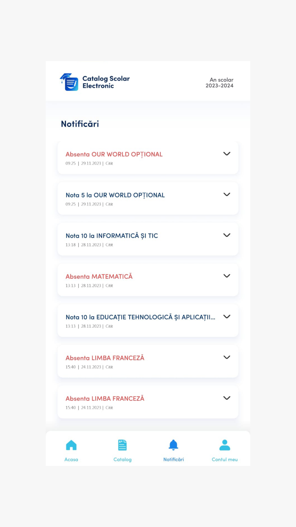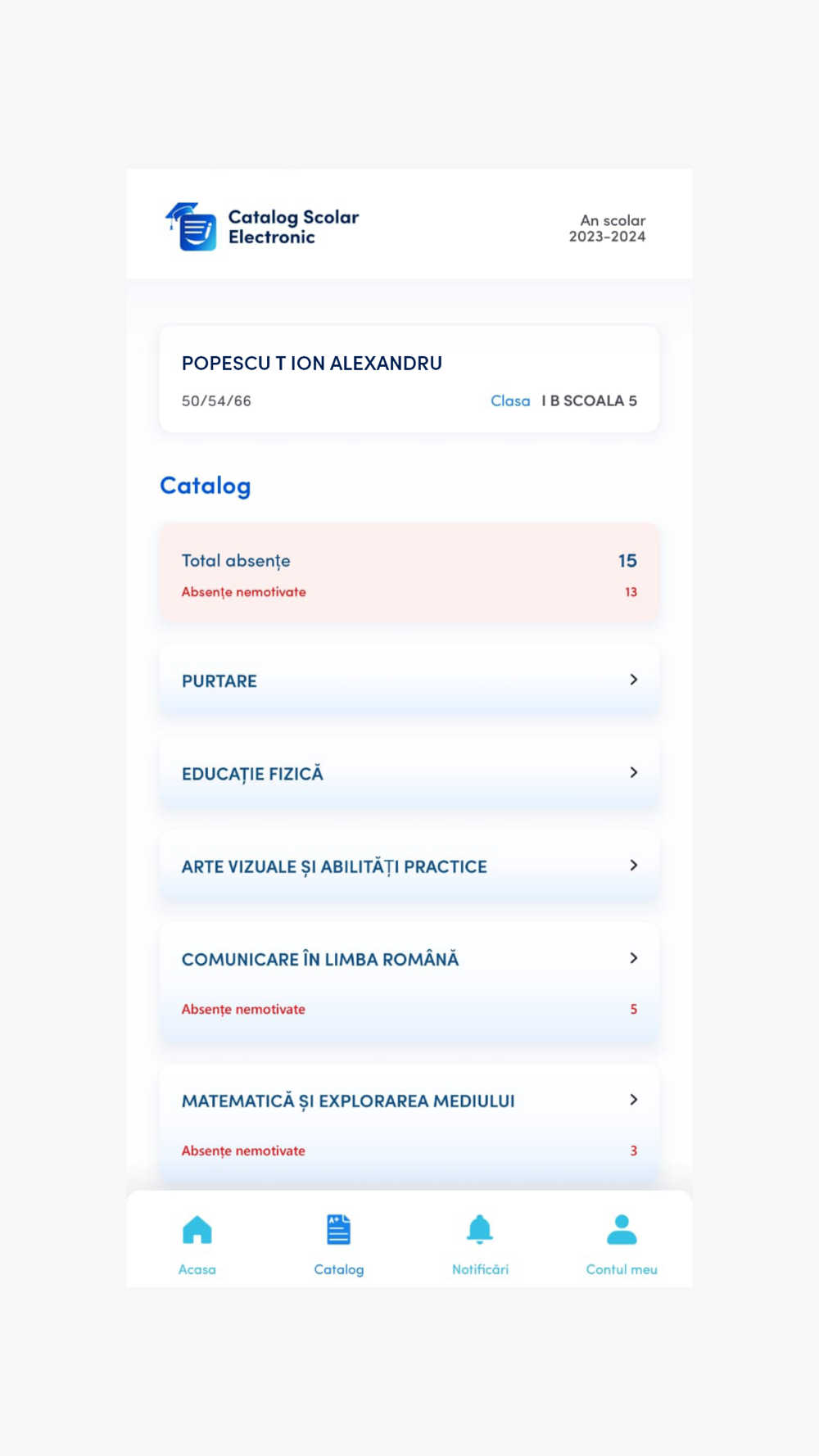 Catalogul Electronic este platforma de management școlar care adună sub o singură umbrelă toate informațiile școlii, ține informați părinții, realizează rapoartele obligatorii și îmbunătățește comunicarea între profesori și părinți. Aplicatia are rolul de a oferi acces rapid catre note, absente, medii in timp real.
