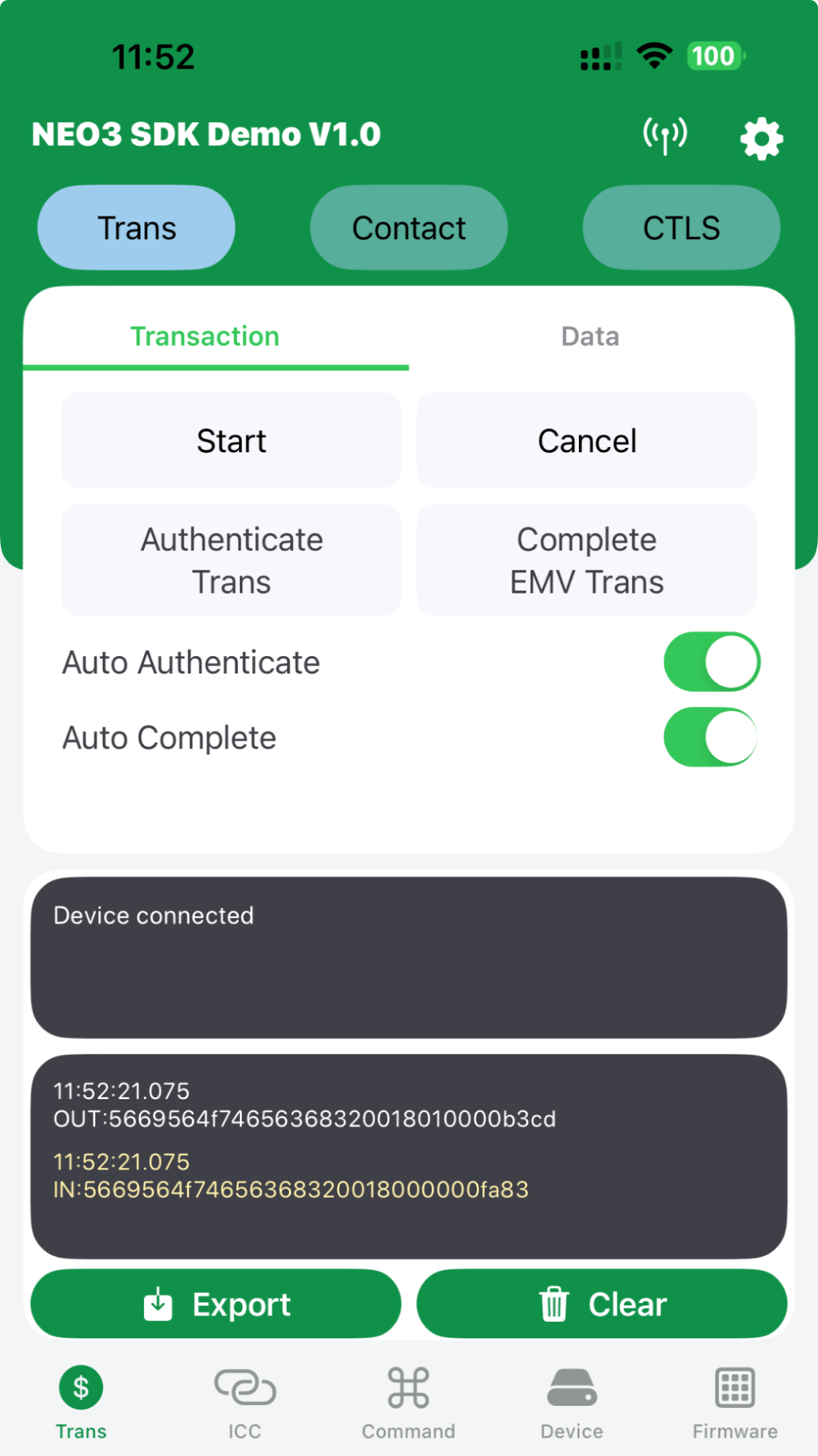 Monitor and test the functionality of ID TECH's NEO 3 mobile payment devices, including the VP3350. Supported interfaces include BLE, Lightning connector, and USB-C. Poll the device for information and run simulated card capture transactions (swipe, EMV insert, and EMV contactless).