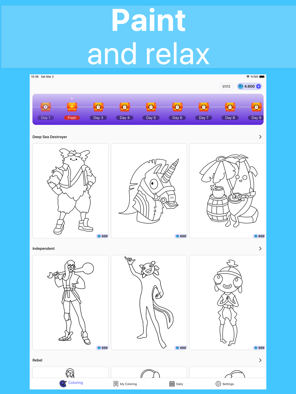 You can color each content for coloring book with many different palettes for painting. Have fun with coloring drawings while using ColorNite