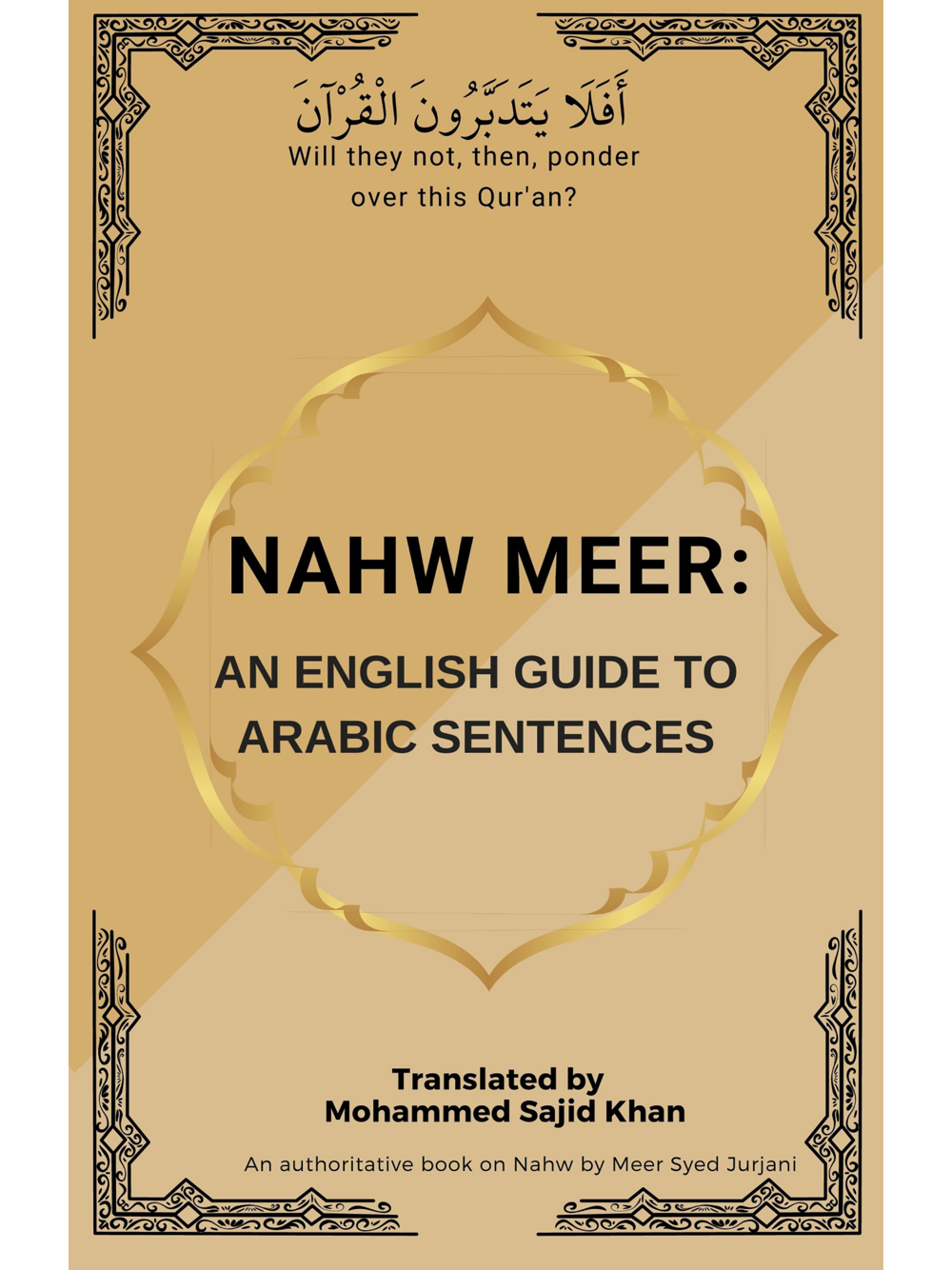 An English Translation of Nahw Meer for the student of Arabic Grammar by Meer Syed Shareef Abul Hasan Bin Mohammed Al-Jurjani (RA). Ilm un Nahw is that science that teaches us how to join Nouns, Verbs, and Particles to form a complete sentence and what the vowel of the last letter of each word should be. This science started from the time of Omar bin Al-Khattab (RA) when one of the Bedouins read part of the Ayah 3 of Surah At-Tauba with a Kasrah at the very end as rasulihi instead of Dammah as in rasuluhu. This changed the meaning from “that Allah and His prophet are free from obligations to the polytheists” to “that Allah is free from obligations to the polytheists and His prophet”. The Bedouin said if Allah dissolves his obligations to His prophet, so do I. After this incident, Omar (RA) ordered that the rules of Nahw be created. Why this book? First Meer Ali ibn Mohammed Al-Jurjani, the Author of Nahw Meer, does not need any introduction. His masterful book has been in use for centuries mostly in its original language of Persian and its Arabic and Urdu translations and it is taught in many schools in the Indian subcontinent and other parts of the world. I felt, that there is a need for a literal translation in today's English for those of us who are more comfortable with it.