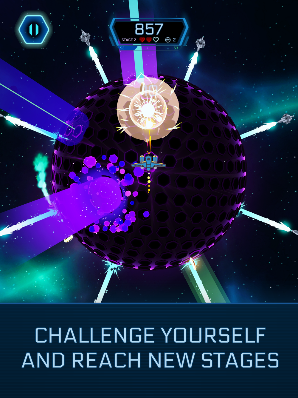 Navigate your spaceship around a mesmerizing sphere made of hexagonal pillars, all while an electrifying electronic soundtrack pumps through your speakers.
