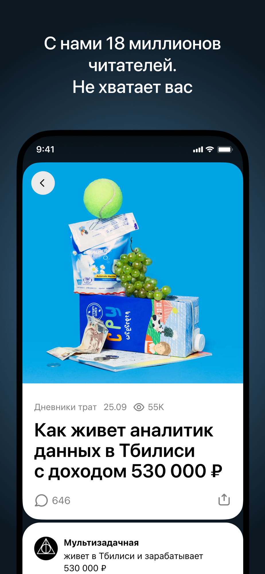 Важная часть Журнала — читатели, ведь они делятся своим мнением и опытом в комментариях и статьях. Сегодня почти 2 миллиона человек пишут в Журнал, а некоторые из них стали постоянными авторами и настоящими легендами. Например, каждый читатель может написать «Дневник трат» и рассказать о неделе из своей жизни. А другие смогут найти там пару лайфхаков, полюбоваться на домашних питомцев или дать автору полезный совет.
