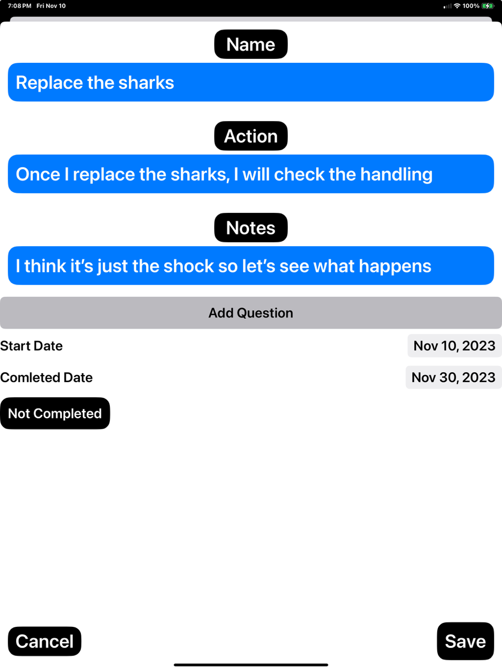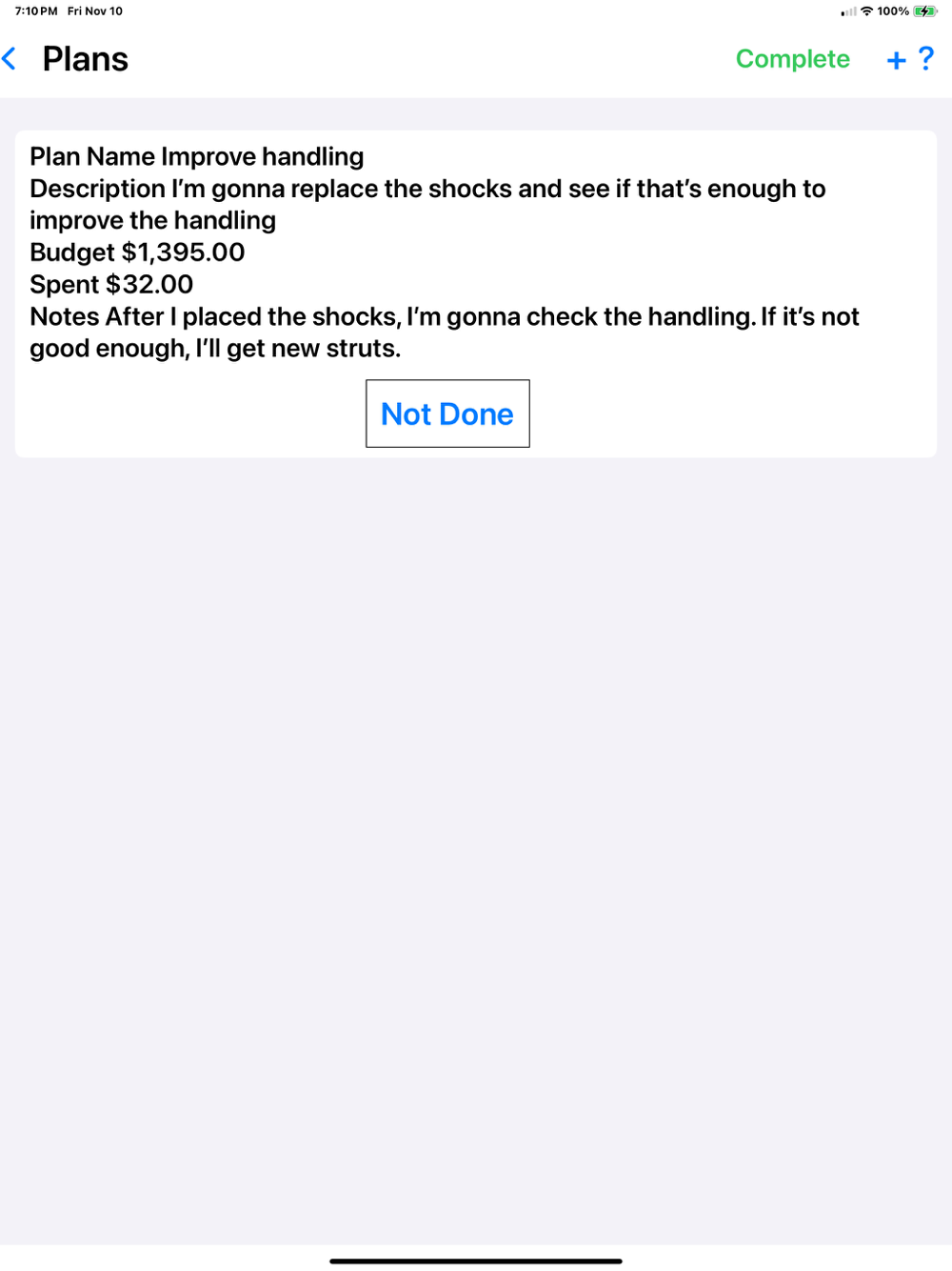 My Car Project lets you keep track of what you have done and need to do with your car. Keep track of Oil Changes, Maintenance, and Future projects.