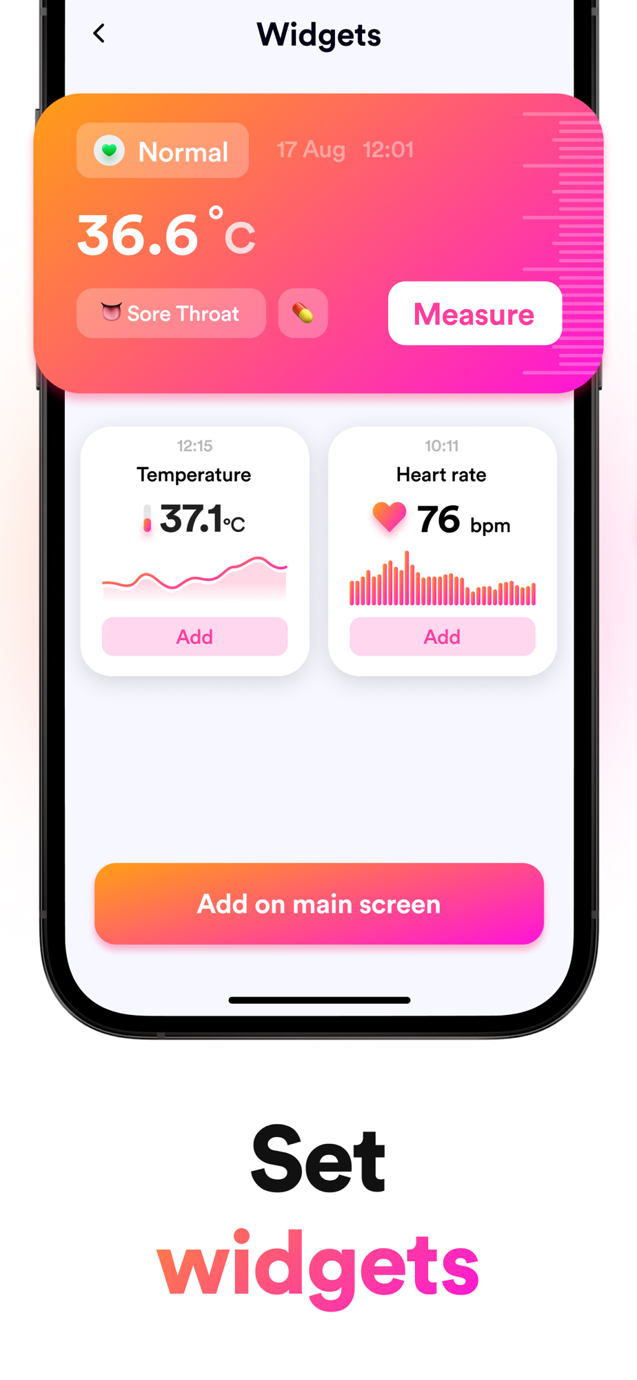 7. Customizable Widgets: Keep important health information at your fingertips with HealthTrack's customizable widgets. Add widgets to your iPhone's main screen, displaying vital metrics like heart rate, temperature, and personalized wellness advice, ensuring you never miss a beat when it comes to your health.