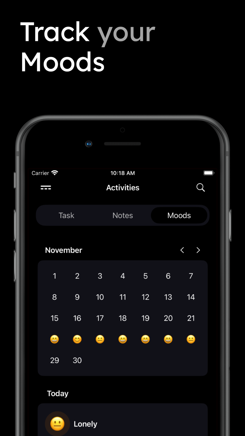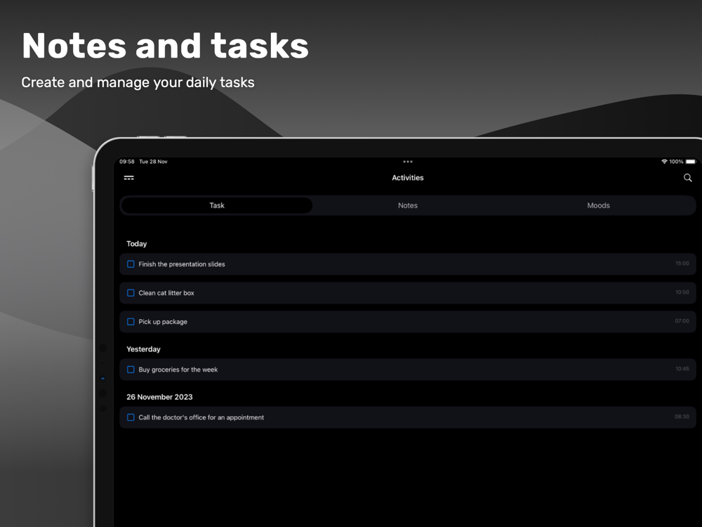 - Keep an eye on your mood and recognize patterns. With the mood tracking feature, you can identify trends and foster positive changes in your life.