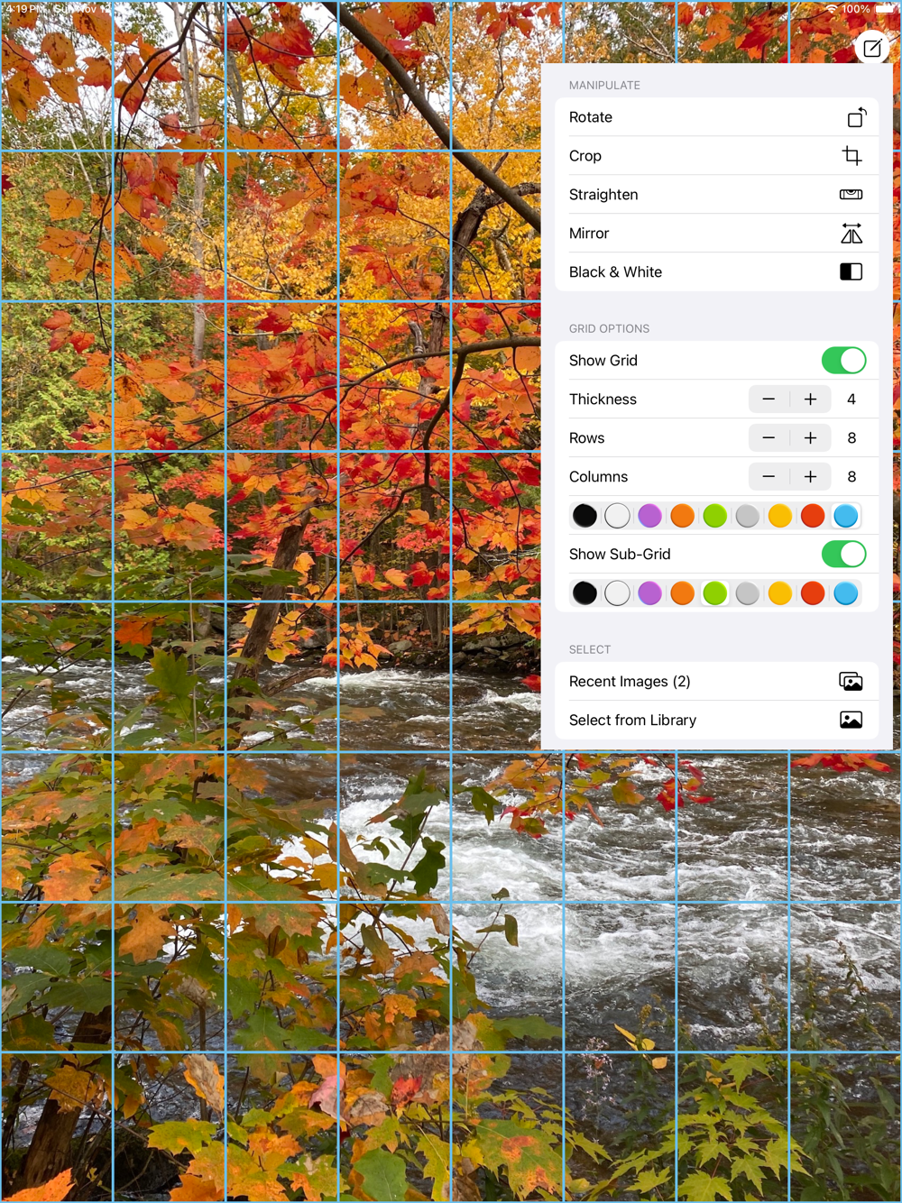 Select images from your photo library, rotate, mirror, straighten, crop and convert to B&W, then preview with a grid. Zoom in, pan to focus on one section of your new creation. Overlay an option sub-grid when zoomed in.