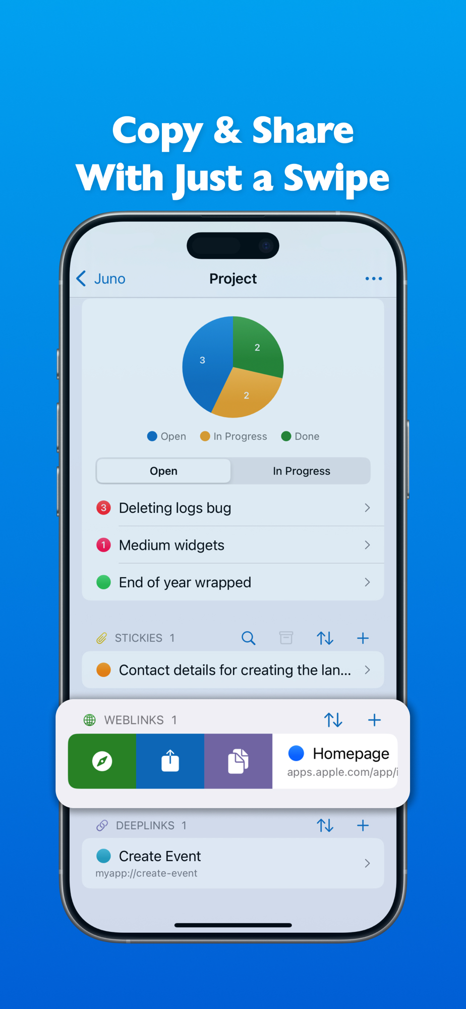Connect your projects with the world. Share and open web links and deeplinks with a simple swipe, effortlessly integrating external resources.