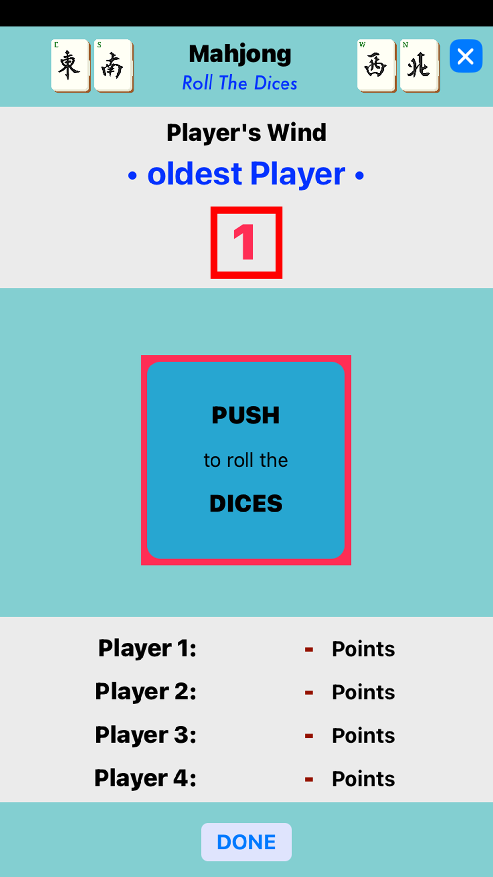 Roll the dice in order of age to choose the player EAST and determine the table order before the game.
