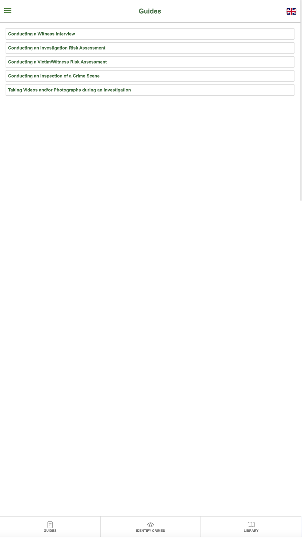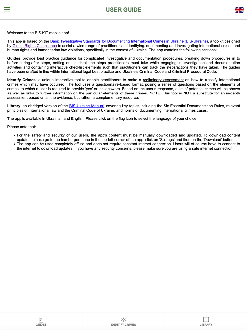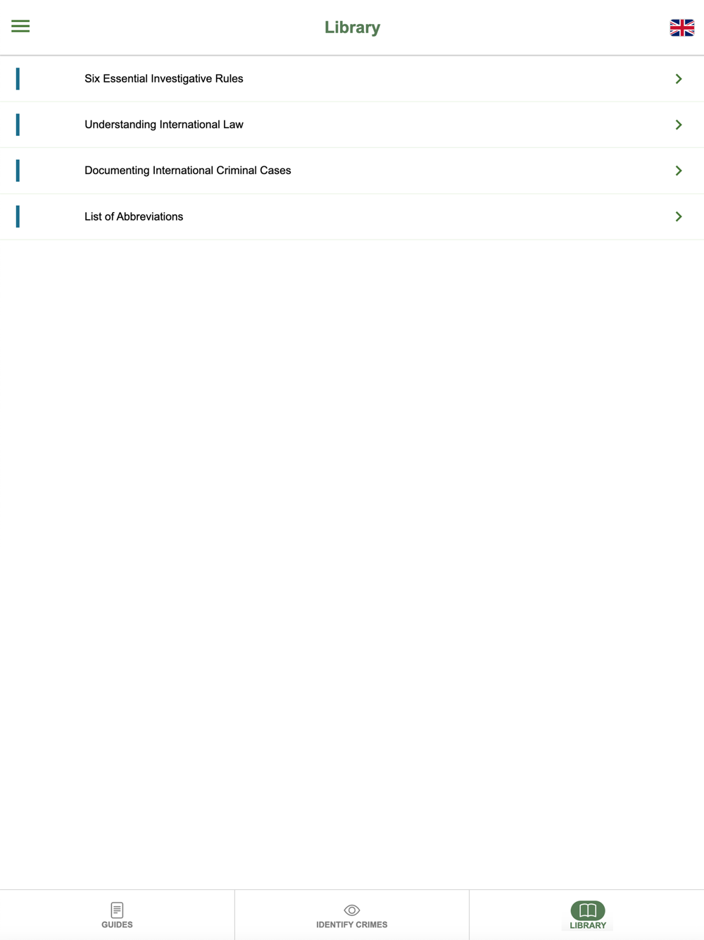 Practical tool to assist investigations and documentation of international crimes, containing procedural guides, questionnaire resources and an informational library.