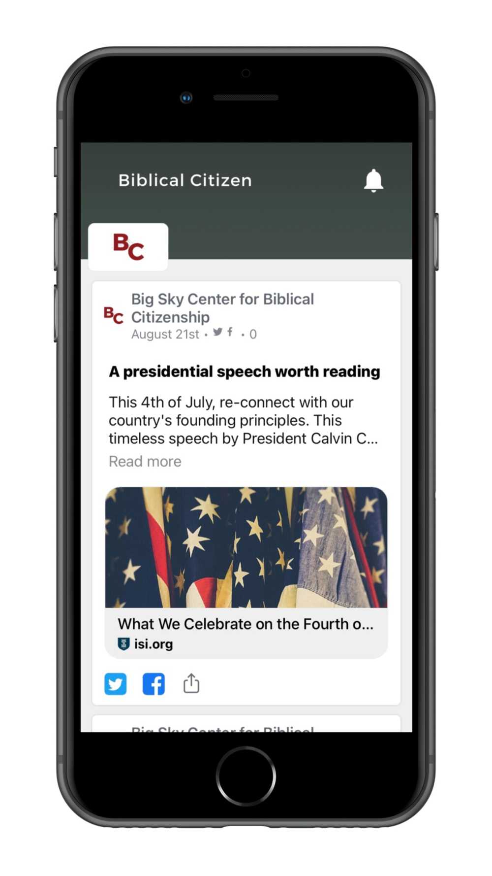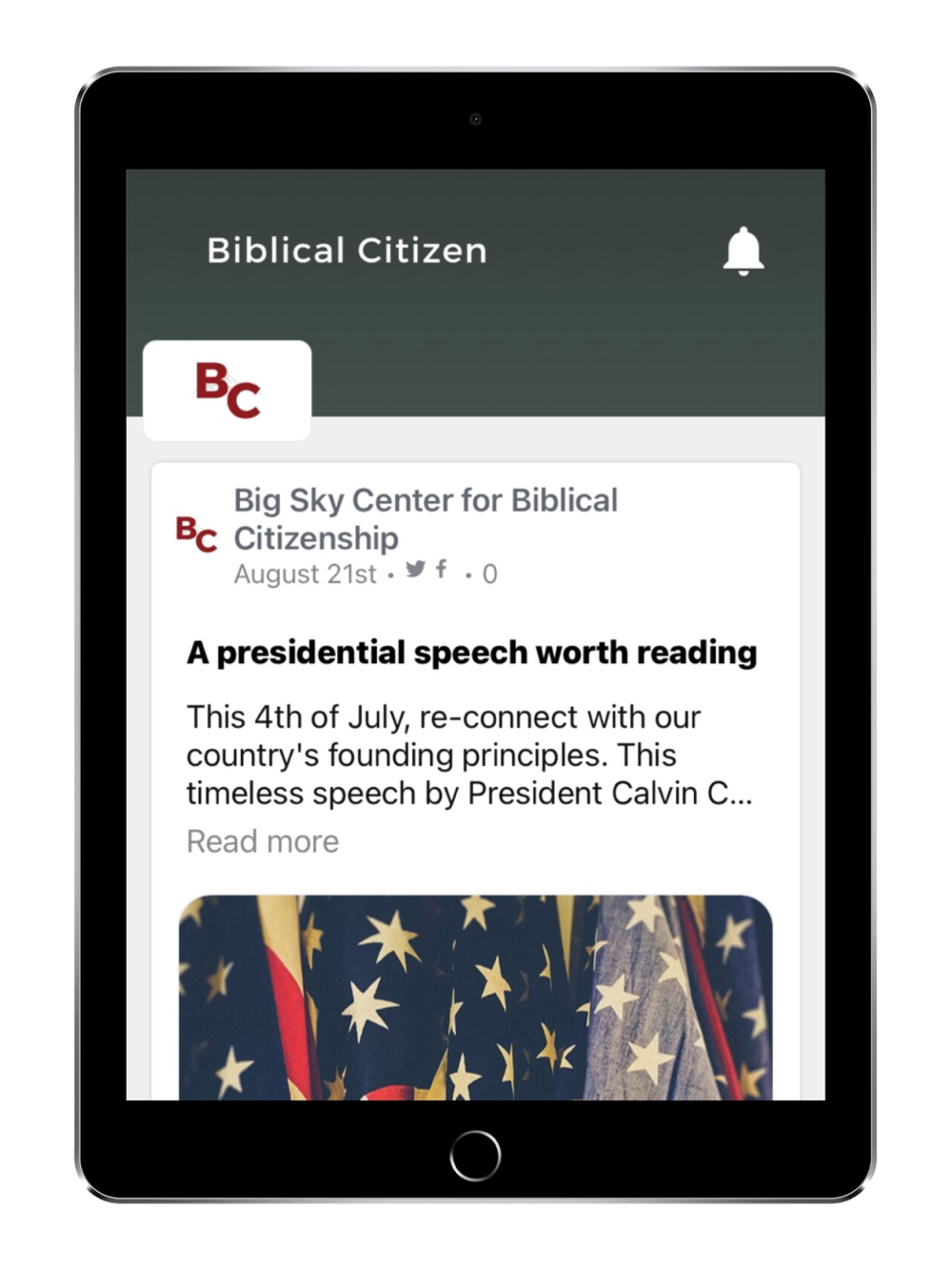 Follow and connect with the Big Sky Center for Biblical Citizenship and other groups in your local community who will have their own space in the app for local information, events, speakers, and opportunities to participate locally.