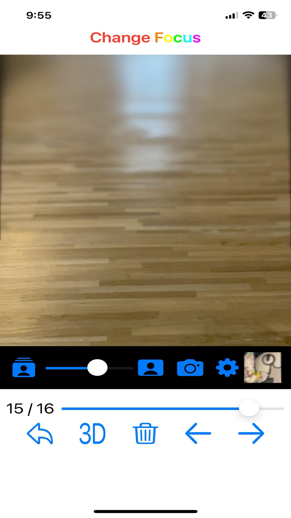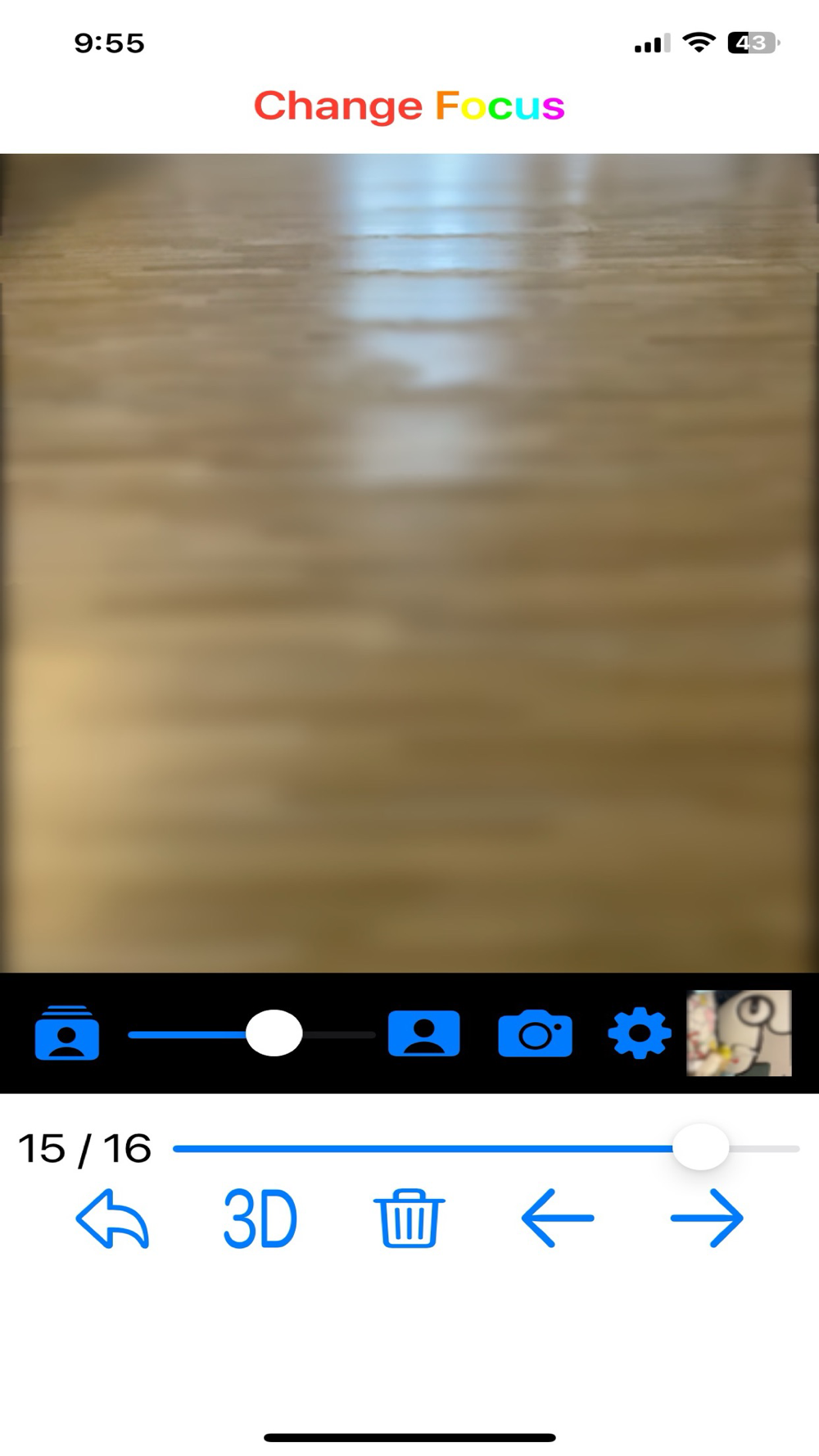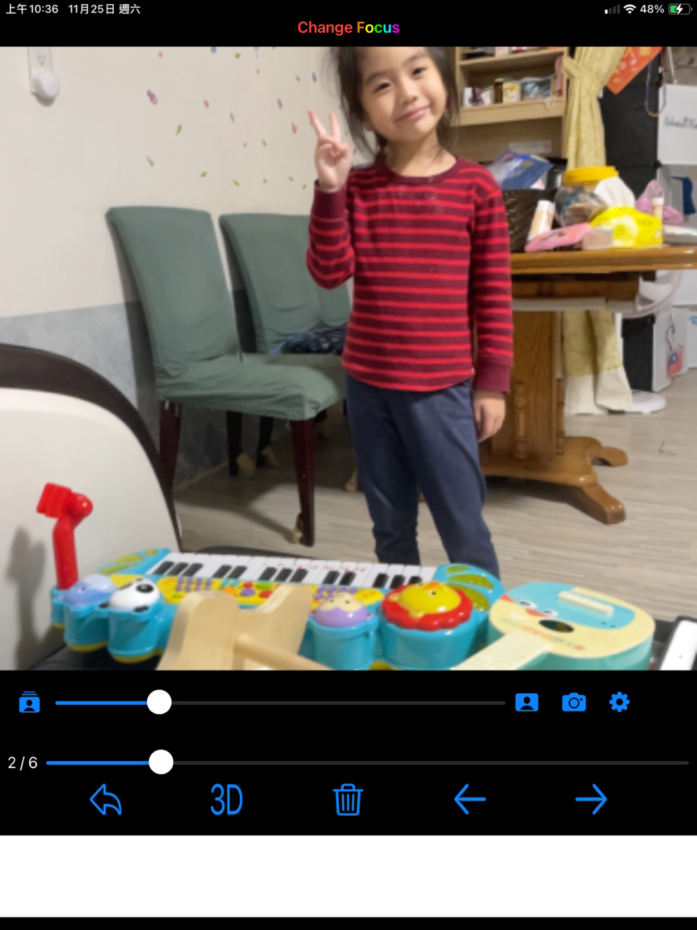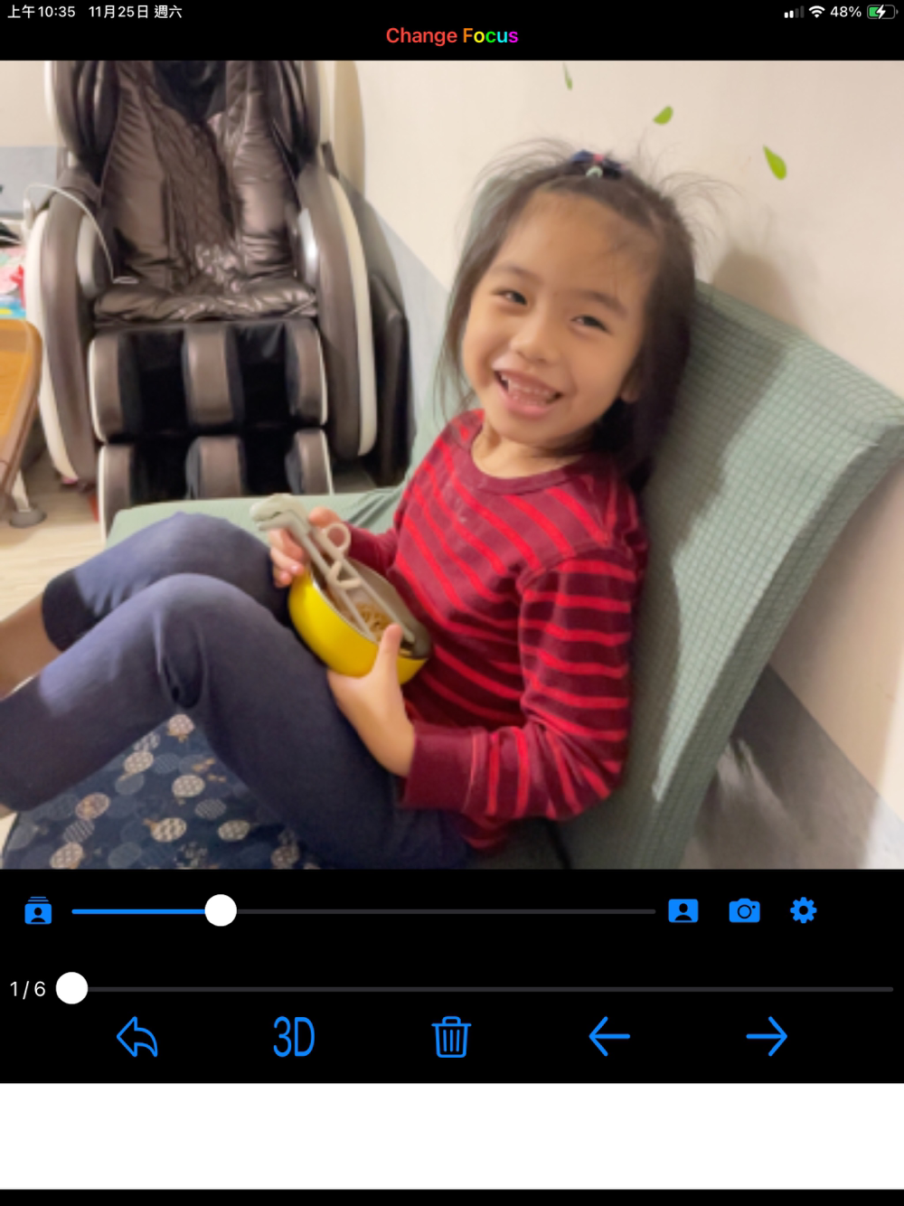 In the beginning, click the center "camera" icon to save the 3D image. Then, browse the photo you just took by clicking the bottom right photo. Click the photo to change focus on the point you click. You can change the blur ratio by dragging the slider. Press the "camera" icon to save the outcome image.
