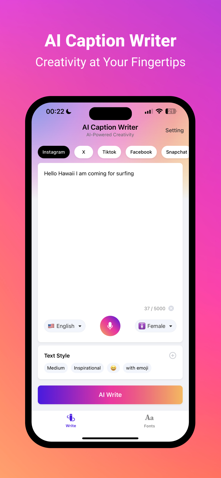 Welcome to Caption Writer AI, the ultimate companion for your social media journey. Whether you're crafting the perfect Instagram caption, composing a memorable tweet, or updating your Facebook status, this app is designed to bring your thoughts and emotions to life in the form of engaging, authentic text.