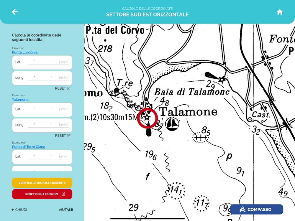 Esercizi Sono suddivisi per argomento: misurazione delle miglia, lettura delle coordinate, calcoli della velocità, del tempo e del carburante. Puoi rifarli quante volte vuoi e verificare subito la risposta. In questo modo puoi fare tanta pratica e acquisire sicurezza.