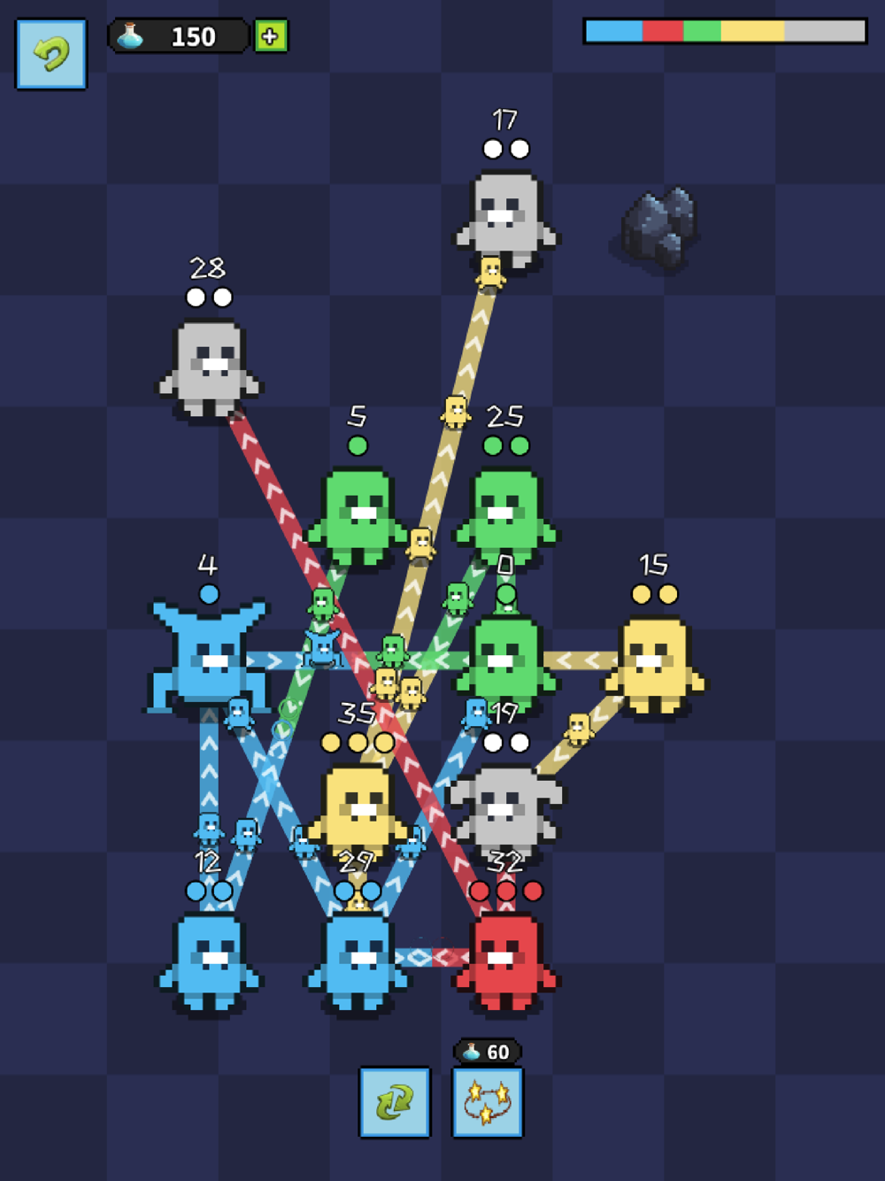 It is a casual puzzle game where players slide monsters to attack the target, occupy all monsters and gain victory. If occupied by other monsters, the game fails. During the game, props can be used to make enemy forces unable to move for at least 5 seconds. Each victory can earn corresponding rewards, which can be used to exchange props. Clicking on the path can cancel the target in the current path and make adjustments, Monsters are divided into three types, including four factions of players.