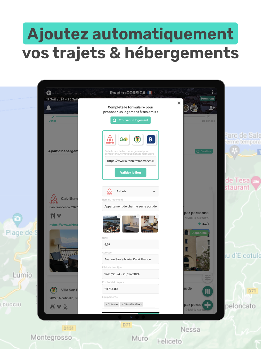 In short, it's a free app that relies on renowned and trusted partners such as Booking, Expedia, Hotels.com, Abritel and Kiwi, to accompany you throughout your trip with friends, and transform a tedious organizational experience lasting several months into a unique experience lasting just a few days!