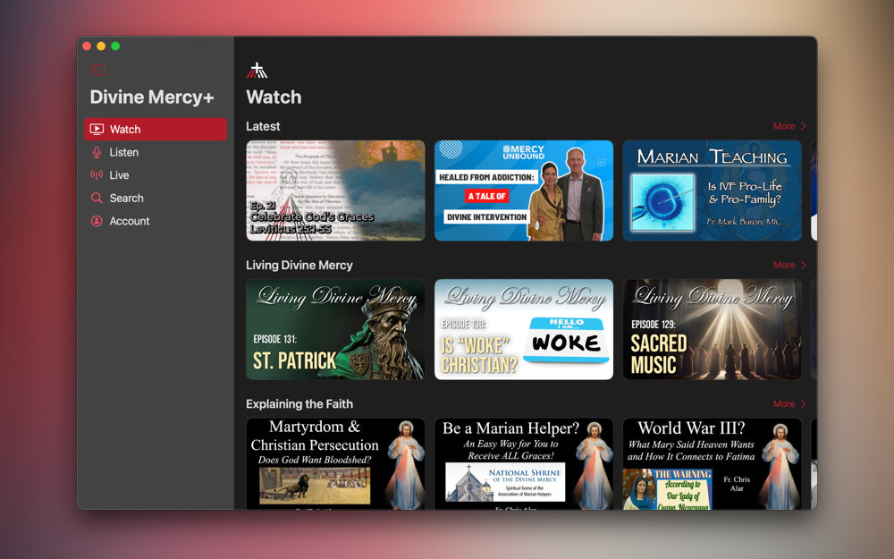 • View past episodes of series like “Living Divine Mercy” (as seen on EWTN) and “Explaining the Faith.”