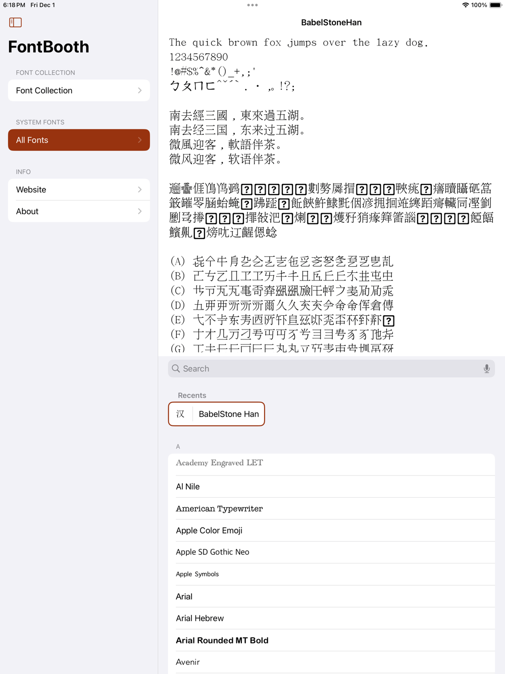 FontBooth is designed to provide fonts that have a high glyph coverage of CJK Unicode blocks, enabling you to continue working on documents on the go.