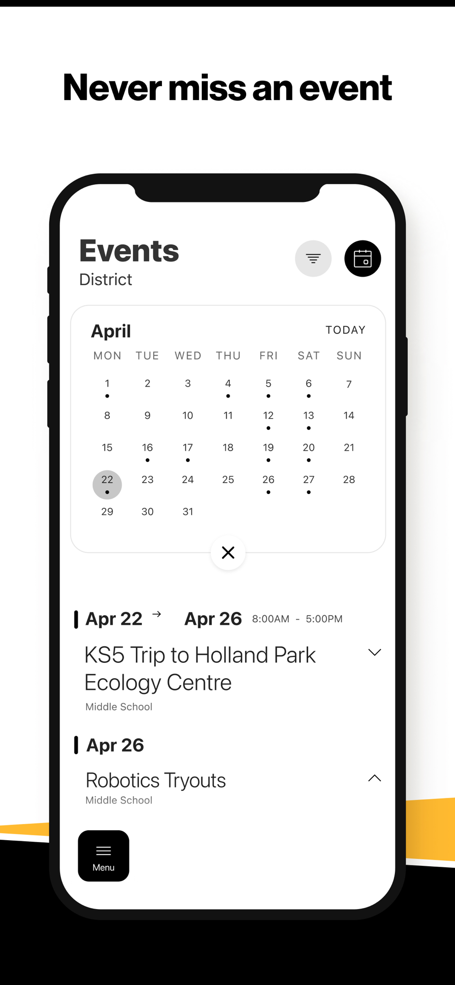 The event section shows a list of events throughout the district. Users can add an event to their calendar to share the event with friends and family with one tap.
