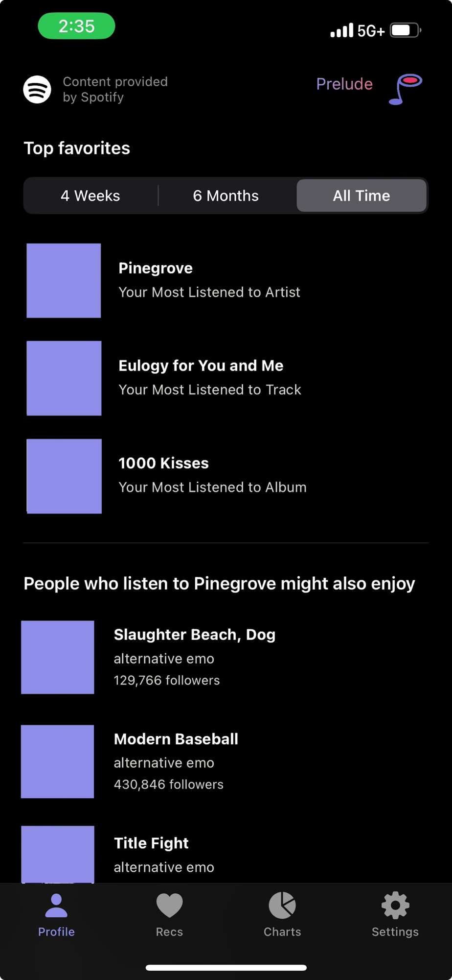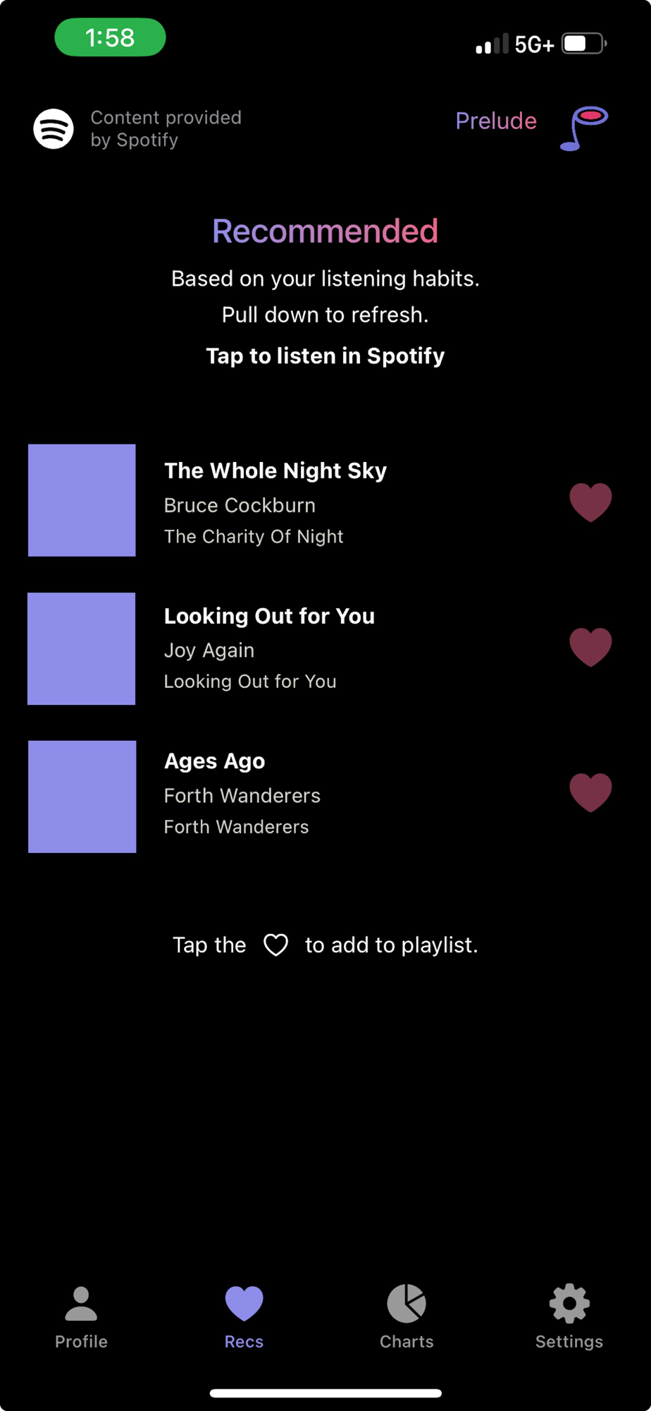 Track your favorite songs, artists, and albums. Get recommendations based on your favorite songs and artists and save them to a playlist.