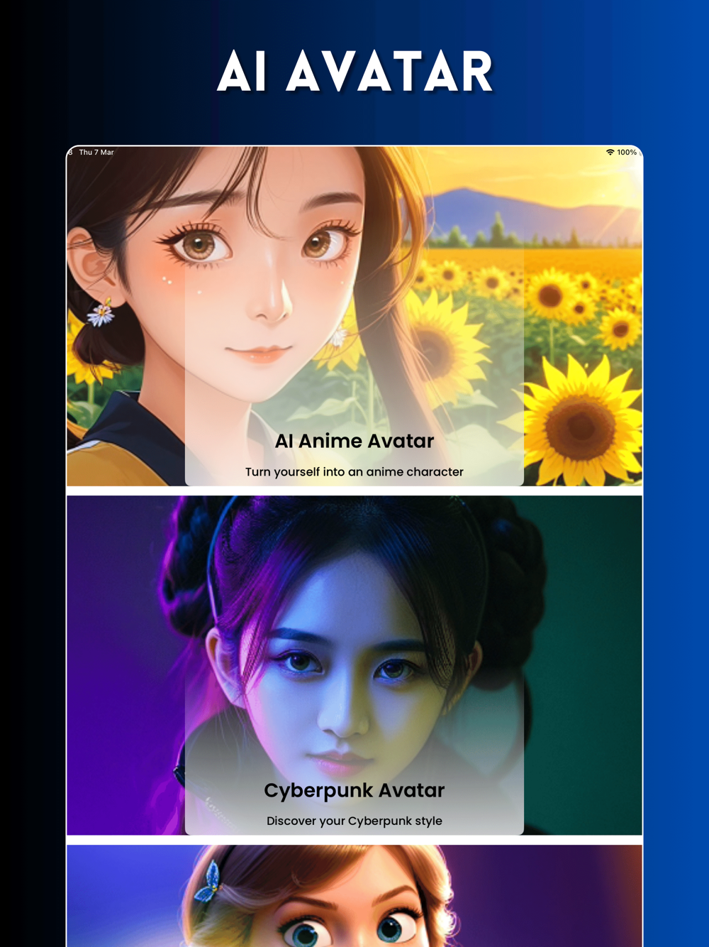 Bringen Sie Ihre Einzigartigkeit mit KI-Avataren zum Ausdruck. Tauchen Sie ein in die aufregende Welt der KI-Avatar-Erstellung, um Profilbilder zu entwerfen, die wirklich herausragen. Von skurrilen und animierten Stilen bis hin zu heroischen oder modischen Avataren bietet unsere App eine breite Palette von Optionen, die Ihre Persönlichkeit und Stimmung widerspiegeln. Diese benutzerdefinierten Avatare eignen sich perfekt für soziale Medien und ermöglichen es Ihnen, Ihre Privatsphäre zu wahren und gleichzeitig Ihre Kreativität zu zeigen.