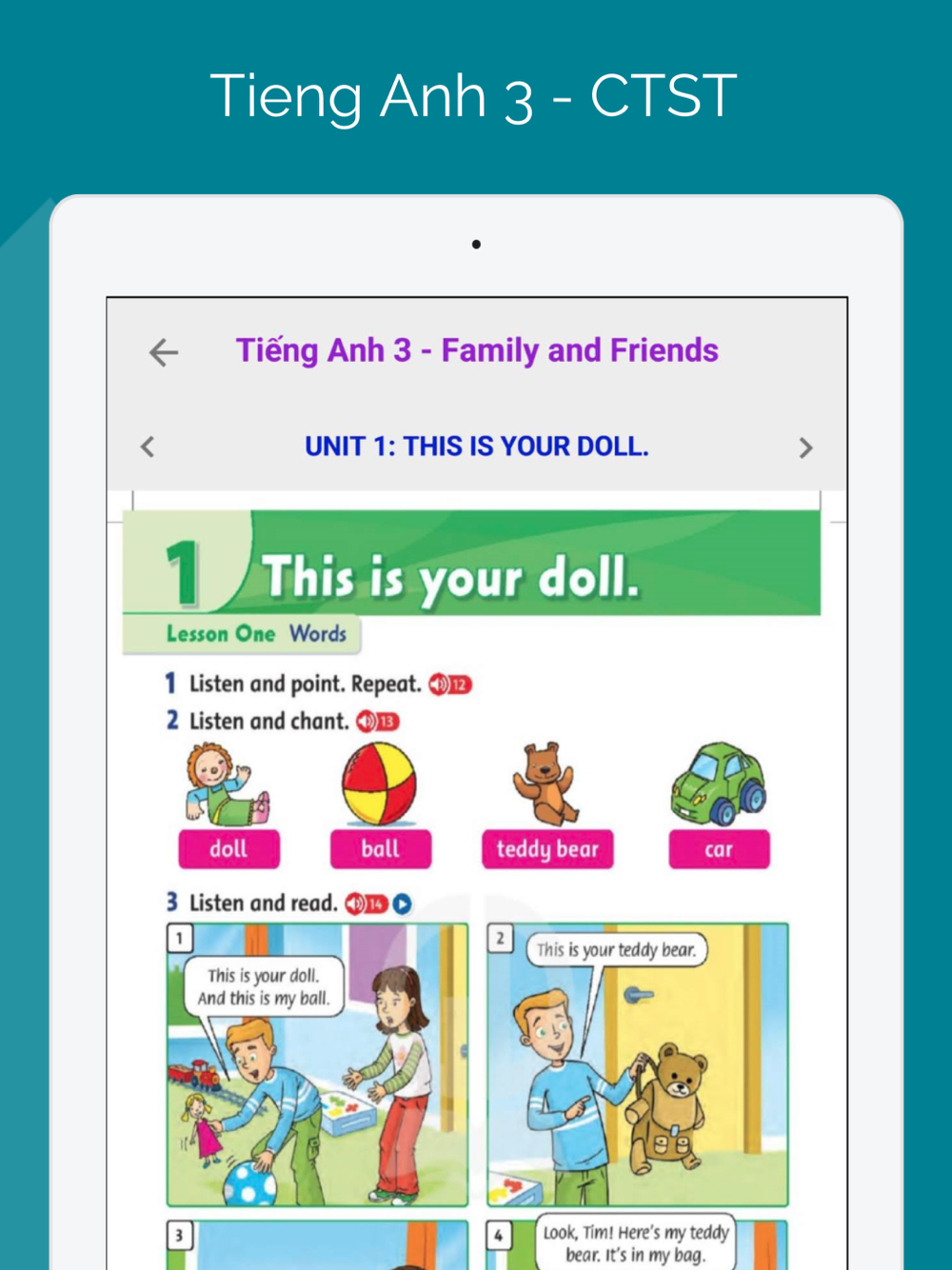 • Each lesson, each section has displayed images along with illustrative audio.