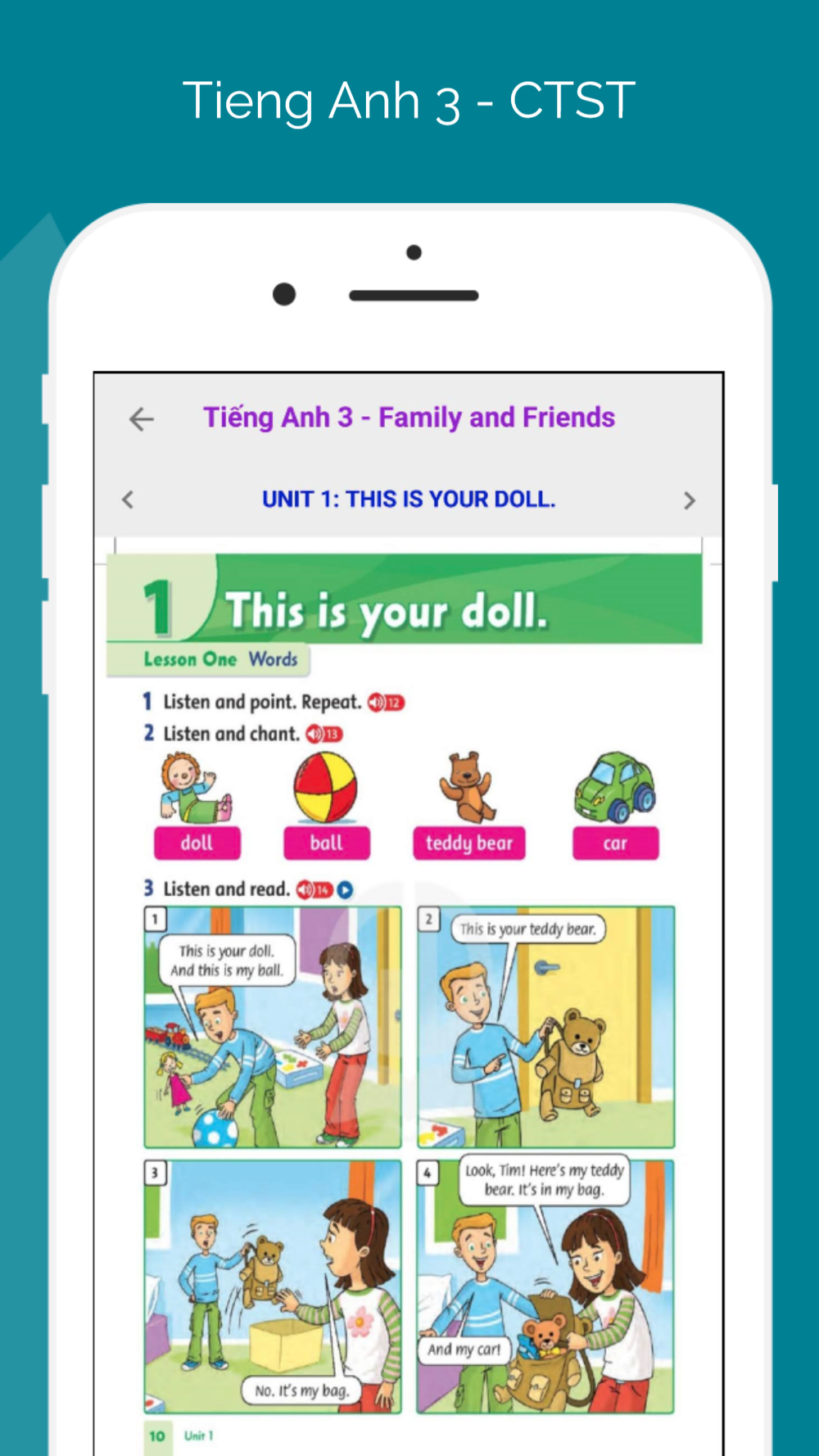 The Grade 3 English application simulates all listening exercises based on the English Grade 3 textbook series 'Chân trời sáng tạo'
