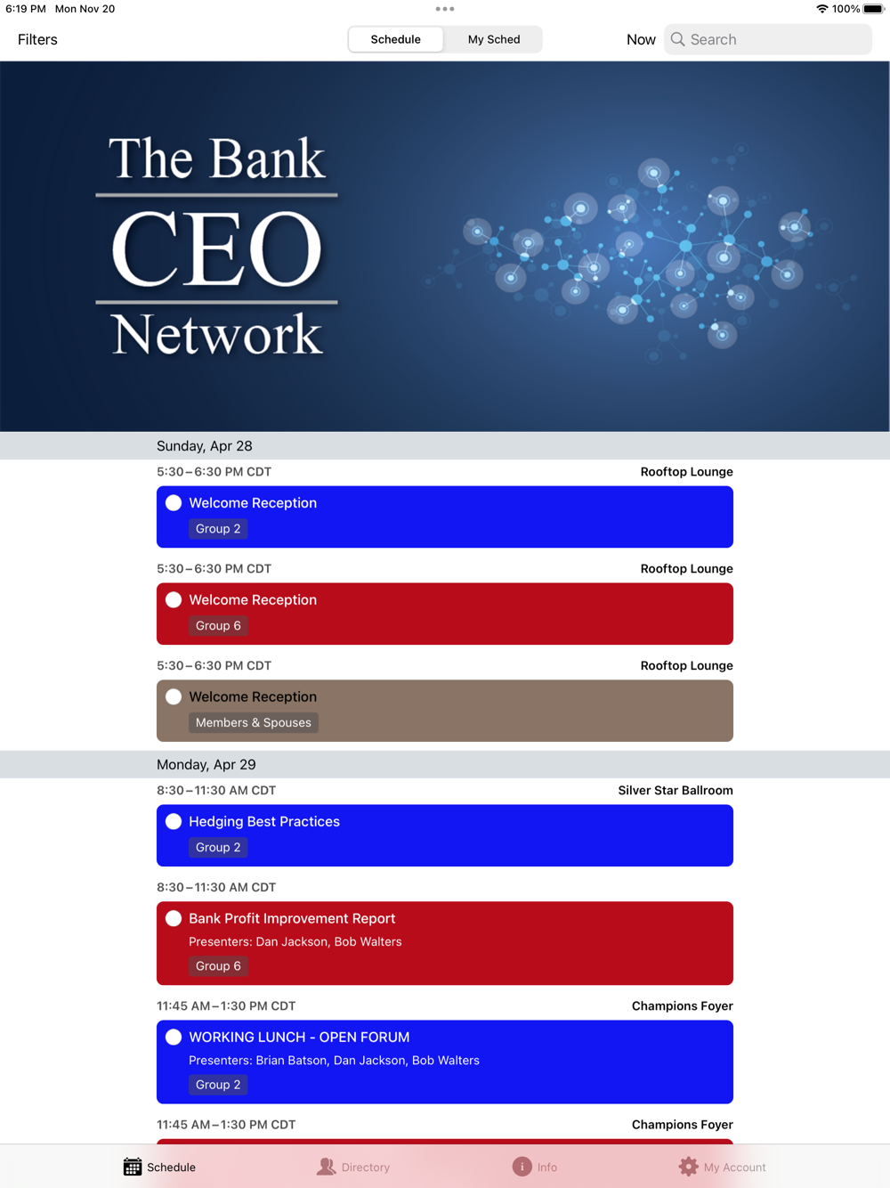 Conveniently browse the entire schedule for Bank CEO Network. Get the key information of your event without ever having to crack open an event guide.