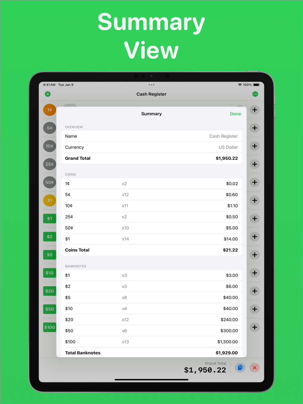 Easily tally bills and coins with a simple tap or enter the amount directly.