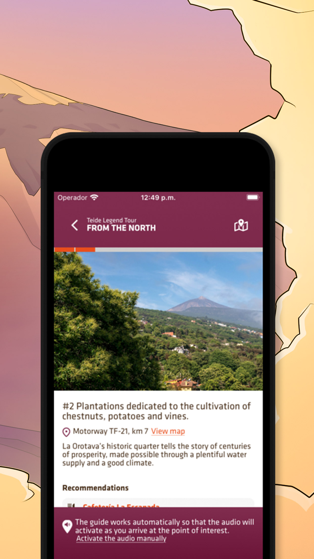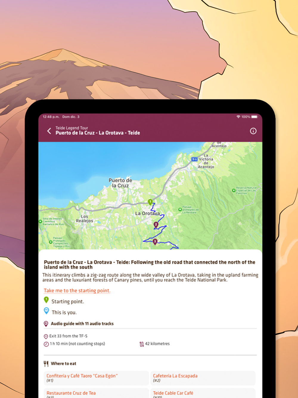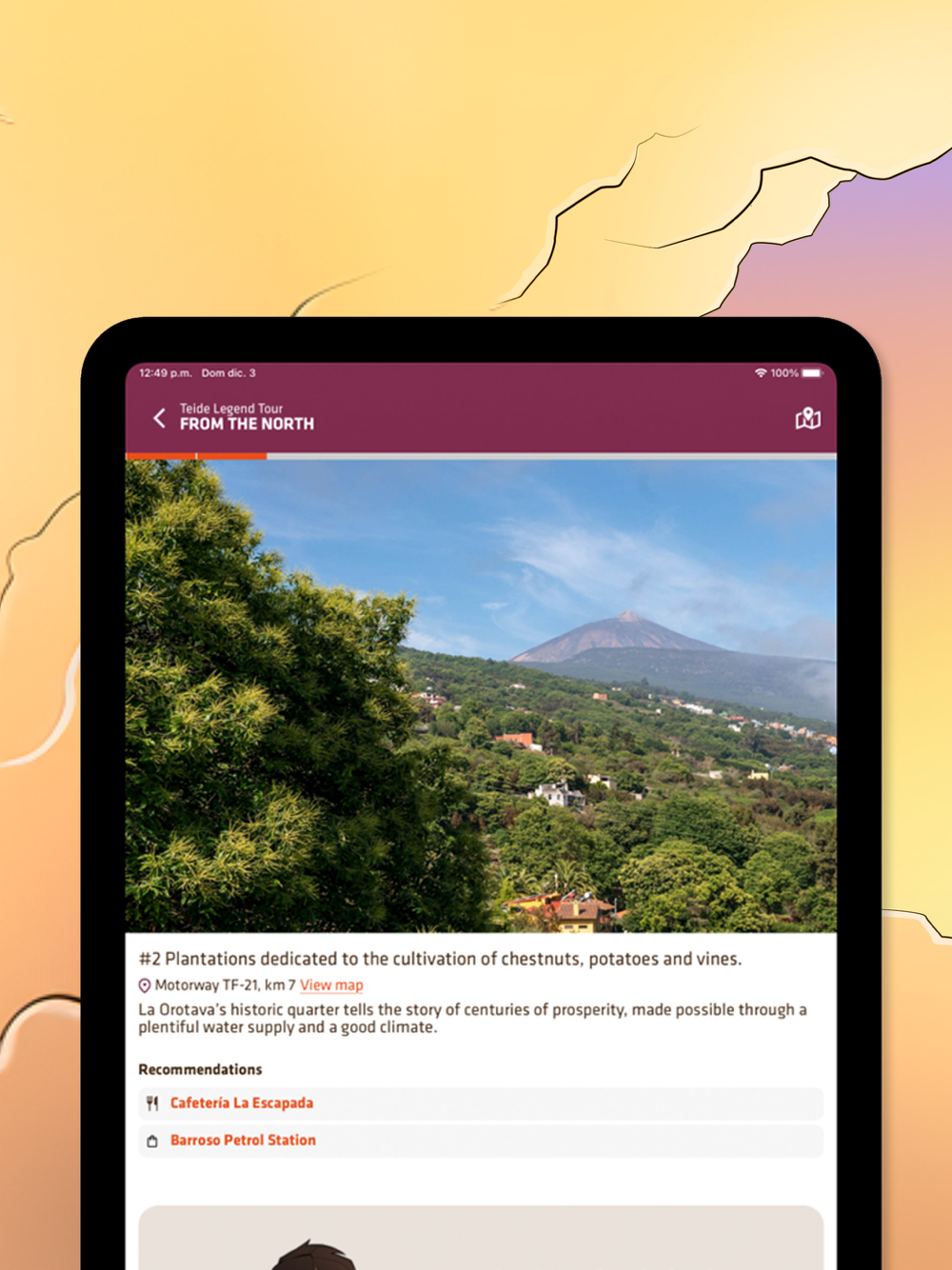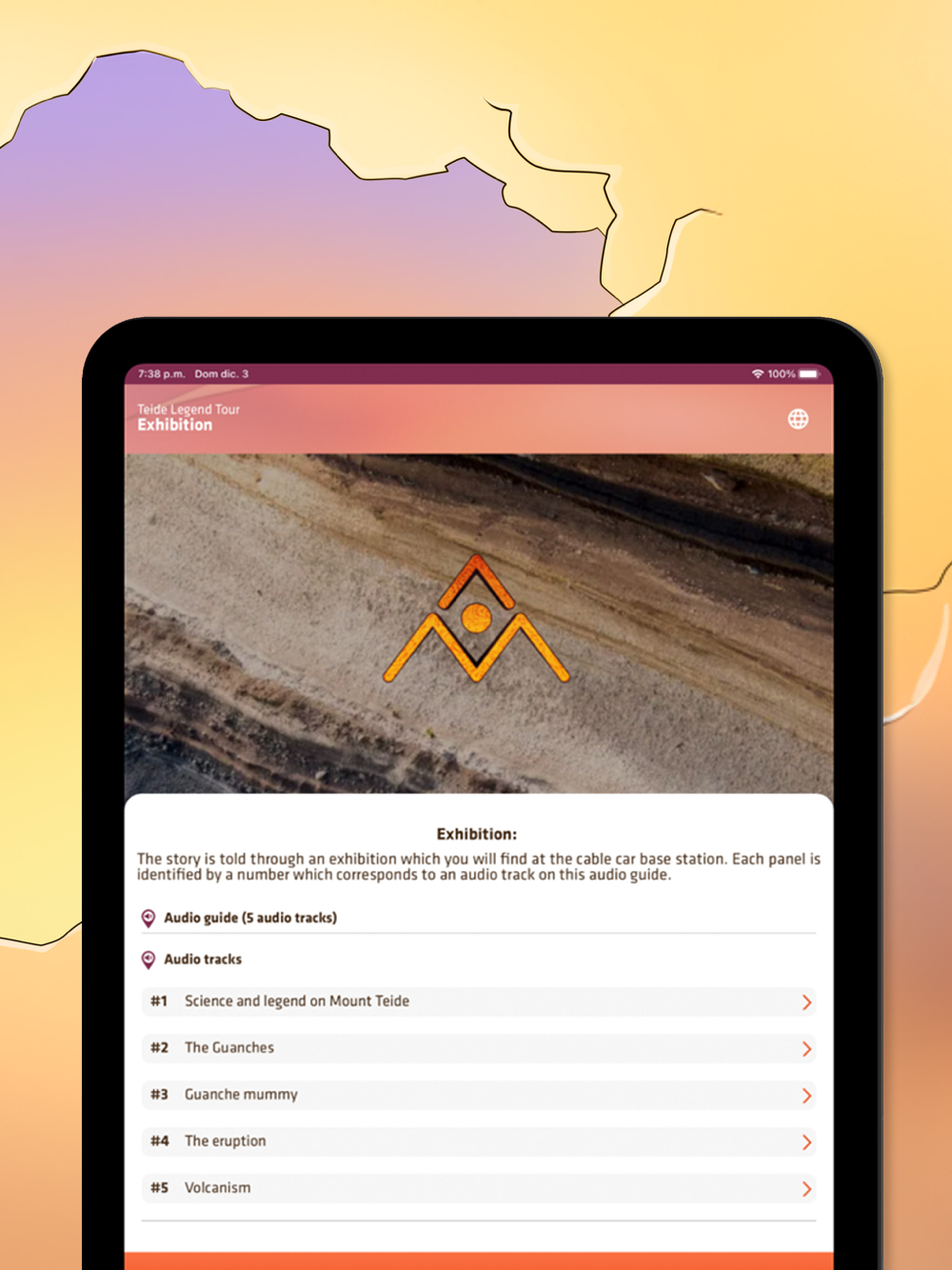 Explore the Teide National Park at your own pace with the Teide Legend Tour. Our complete audioguide will accompany you from the moment you leave your hotel until you arrive at the Teide Cable Car Visitors’ Centre, where you can enjoy a unique experience for the whole family—the “Science and Legend” exhibition. Start the tour when you set out from your accommodation, whether in the north, south, east or west of Tenerife, and explore the main recommended tourist attractions (viewing points, restaurants, local businesses) you will find along the way, all at your own pace. The audioguide also includes information about hiking and walking trails along the paths of Mount Teide. The perfect tour to enjoy with children, even if the cable car is closed. All you need is a smart device and an Internet connection!